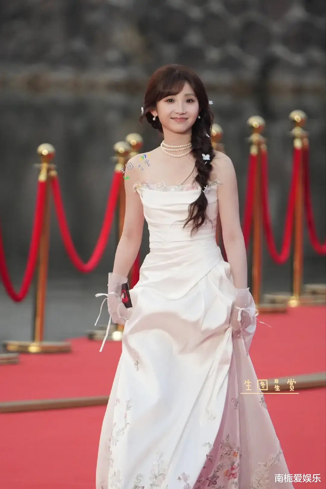 她身着一袭白色抹胸长裙,简约剪裁勾勒出优雅身形,珍珠项链与手套点缀其间,光泽流转,与她白皙的肌肤相映成辉,仿佛自带柔光滤镜。麻花辫的俏皮设计为整体造型注入灵动气息,深红地毯与她清透气质形成鲜明对比,宛如童话中的公主走入现实,被媒体盛赞为“梦幻美少女”。