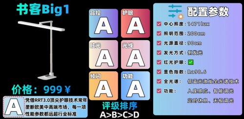 书客Big1在配置和性能上同样出色,搭载五阶光学引擎,规避掉传统台灯的简单亮度调节,转而升级为场景化的护眼矩阵,每一档亮度都基于视觉工程学与光生理模型精准设计,均经过实验室级标定。同时还满足了TM-30光学标准,实现Ra98.6高显色与Rf≥99色彩逼真度,呈现自然真实的光色效果。无论是学习还是阅读,这款台灯都为青少年提供了最舒适、最安全的护眼环境,是同规格下“盲入不会错”的顶级护眼选择。