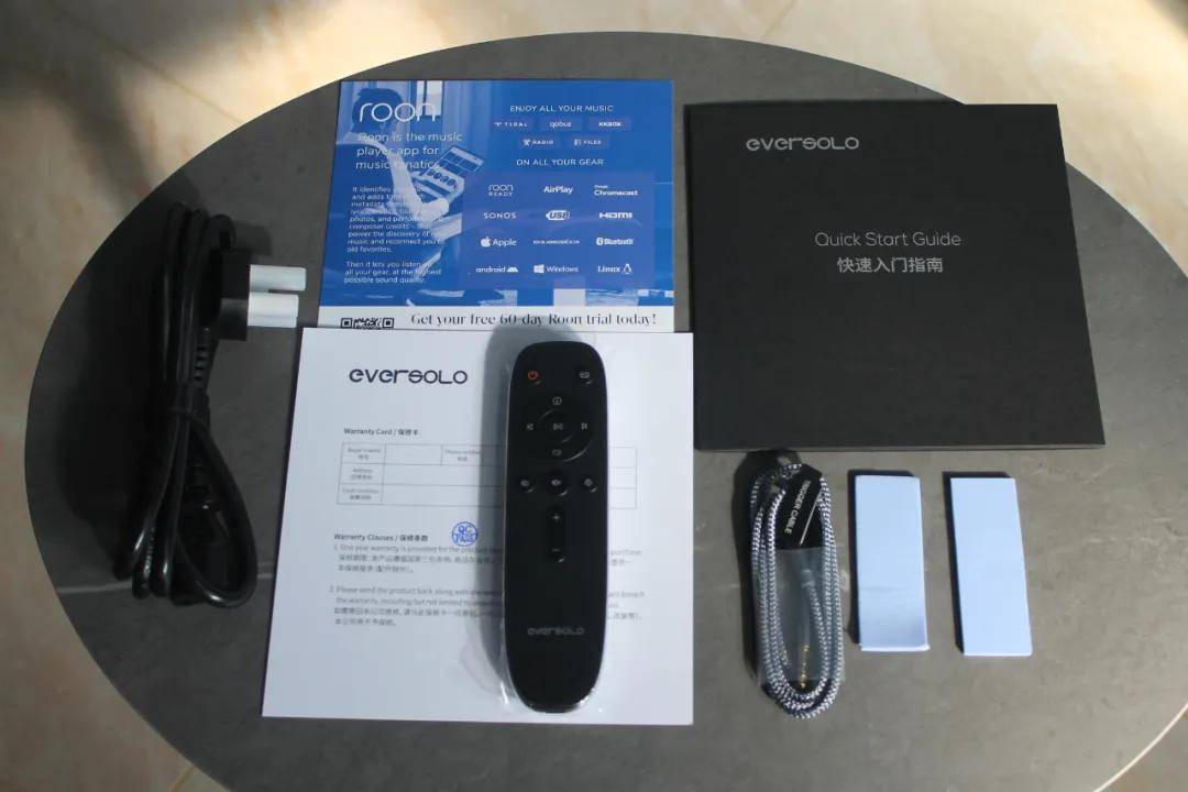 配件包里除了一条电源线和联动控制线,两个固态硬盘导热贴,还附赠了两个月的roon试用卡,以及一枚从背面看相当圆润、精致的充电式蓝牙红外双模金属外壳遥控器,看起来也颇有贵气,可以用Type-C手机充电器给它充电。