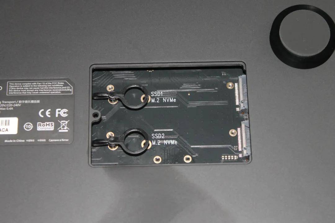 底部还有一个免工具拆卸的金属盖子,打开可以看到两个M.2 SSD插槽,支持双8TB存储容量,无损音乐装满够听几年的了。