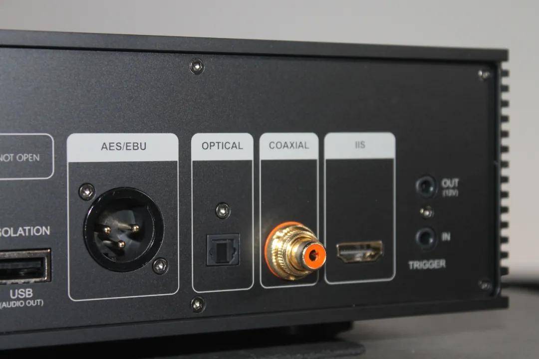 比较传统的同轴和光纤接口自然少不了,这也是最古老、最常见的数字信号输出接口,同轴接口是一颗镀金的RCA插座,看起来用料还不错,可以兼容大多数普通解码器。