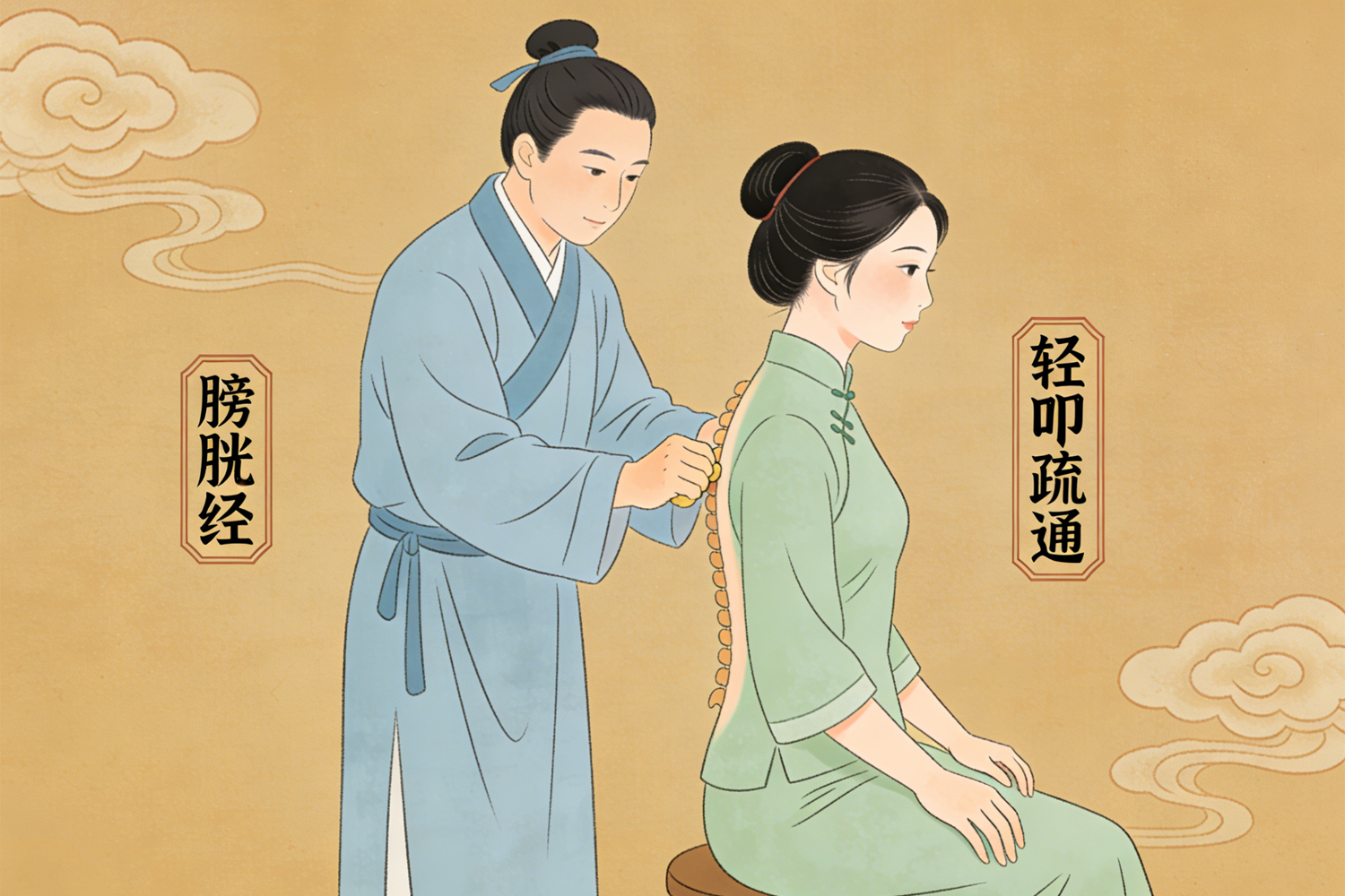 这条贯穿头、背、腰、腿的纵行经络,是久坐最主要的受害者。卡顿点多见于腰骶部的“膀胱俞”附近,表现为腰眼深处酸胀、僵硬,甚至牵扯至整条腿后侧。每天下午3-5点(膀胱经当令时),沿脊柱两侧旁开1.5寸,用按摩梳或空拳自上而下轻叩100次,可帮助疏通这条“主干道”。