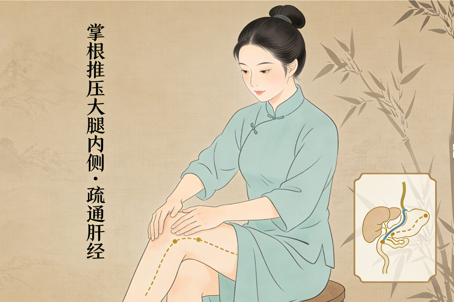 “肝主筋”,久坐令筋腱缩短,直接累及肝经。堵塞常发生在大腿内侧(脾关穴至膝关穴段),引发大腿根部紧张、情绪烦躁、肩颈僵硬。睡前坐姿,从大腿根部沿内侧中线,以掌根缓慢推压至膝部,左右各5分钟,能松解筋结,兼助肝气调达。