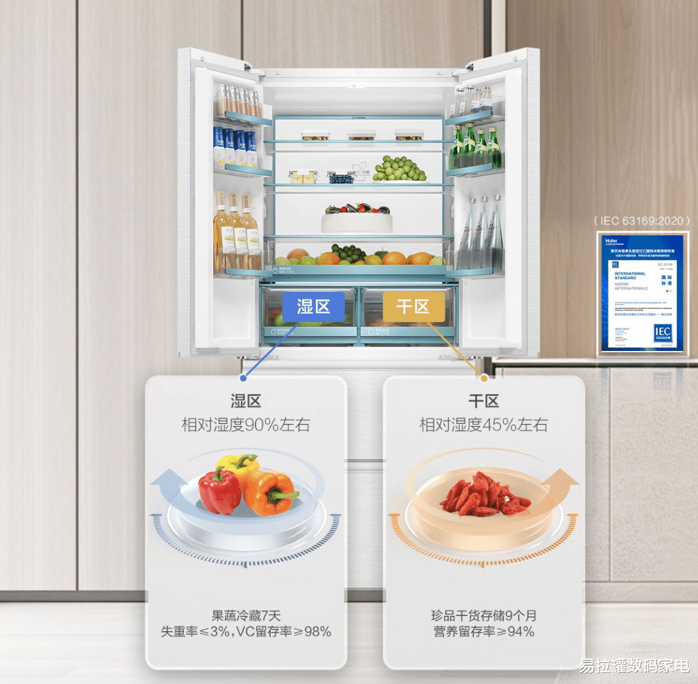 海尔冰箱配置特点:全空间保鲜科技:实现冷藏与冷冻双重一级健康保鲜标准,守护食材原鲜营养与口感。冷藏干湿分储:湿区锁水保鲜,果蔬新鲜如初达7天;干区干爽,珍品干货9个月营养如初。冷冻智能恒温:专利保鲜技术,风机遮蔽阻隔化霜热气回流,食材温度波动极小,保持牛肉等食材原汁原味。健康保鲜标准:达到一级健康保鲜,牛肉冷冻30天汁液流失率极低,蛋白质营养折损小。EPP超净系统:五效合一,除菌、除异味、除BD、降农残、防霉菌,保障食材安全。