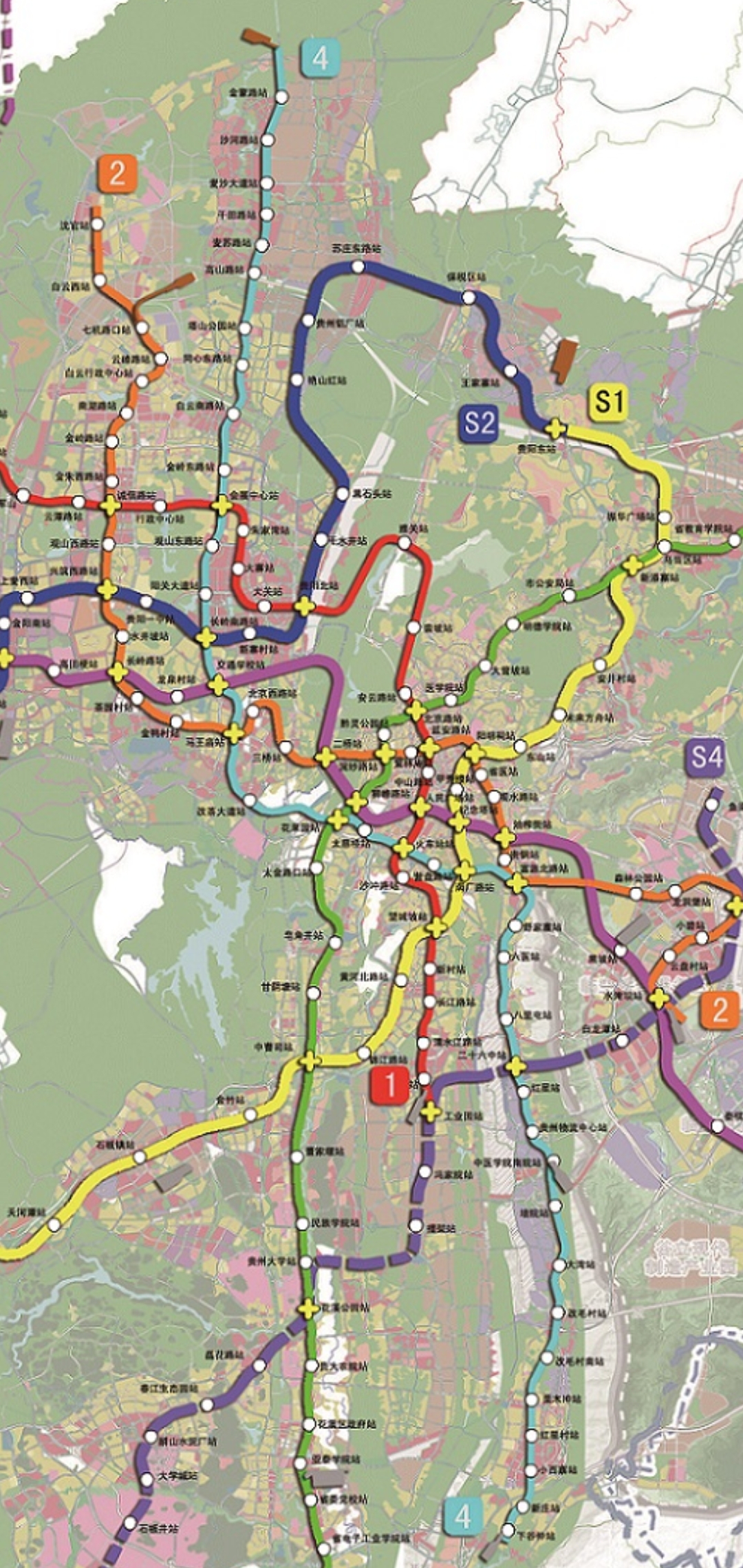 按照远景年线网规划方案图,贵阳的城市地铁,一共是有9条线路的,其中1~4号线,属于主要穿行主城区而过的地铁线路,而S1~S4以及G1线,则是连接周边城郊或城际之间的线路。