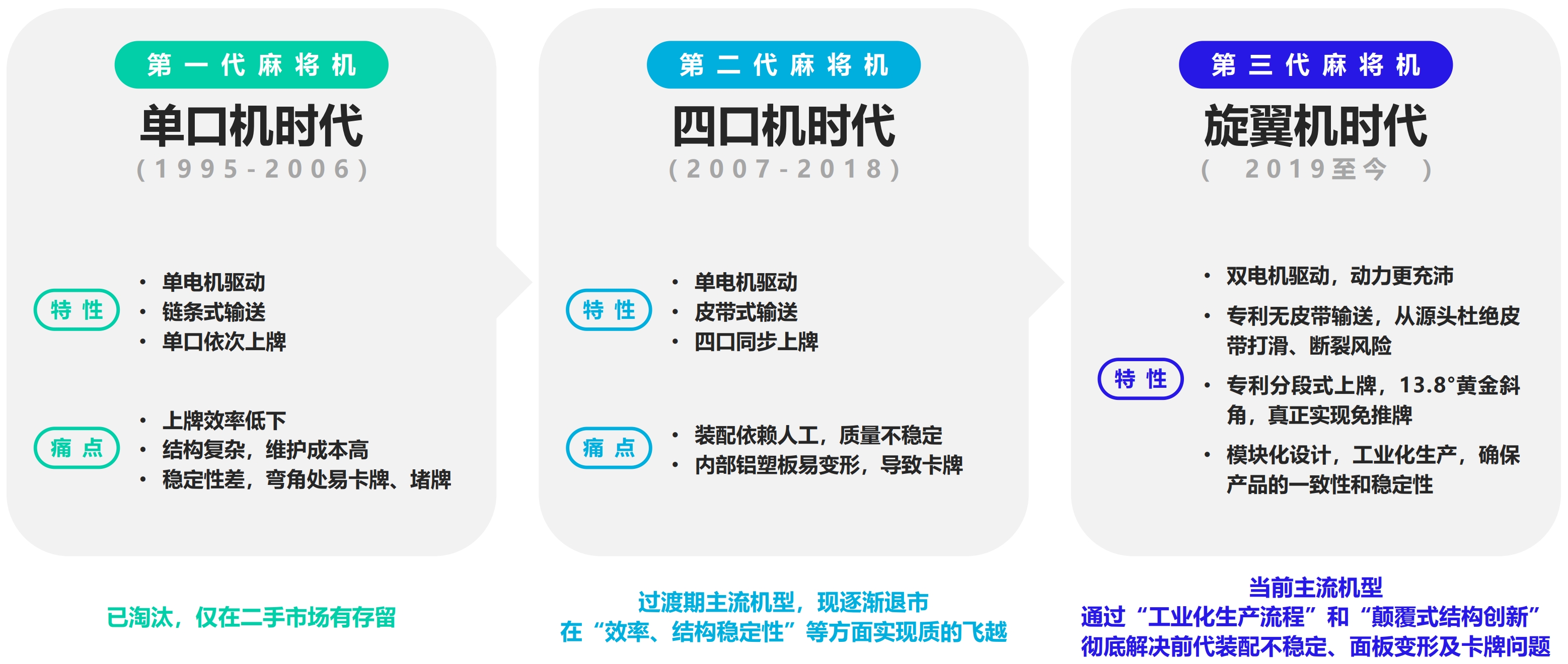 该品牌T3.0智旋麻将机平台采用专项技术高分子免喷涂工艺,通过四大主要系统重构产品性能:智旋太极洗牌系统采用双电机对称精密齿轮驱动配合创新动态刮牌器,将洗牌电机寿命延长至传统产品3倍以上,实现图书馆级静音效果;智旋乾坤抓牌系统取消易损薄皮带,采用电机直接驱动吸牌轮,趋近零故障运行;智旋旋翼上牌系统运用阿基米德螺线型储牌槽设计,阻力降低50%,整体上牌时间提升20%以上,主流牌型上牌只需4秒;智旋智能交互系统集成手机APP远程管理、3+1防弊体系、智能自检与数据化运维功能。