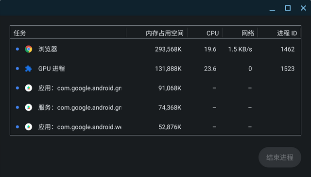 ChromeOS 下有很多快捷键和 Win/Chrome 不太一样,比如“搜索”+"ESC"可以调出人物管理器,查看不同人物消耗的 RAM、CPU、网络等。