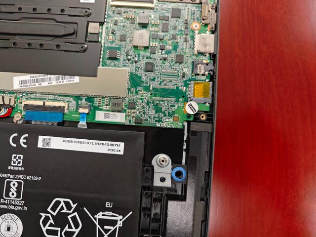 主板右侧可以看到空的M.2 连接器焊位,据说自行焊接 M.2 盘位后是可以使用的,不过以我目前使用来看(ROM)也没有太大扩容的必要,反而是 RAM 如果能升级到 8GB 可能对于系统体验提升更大一些。部件上的标签可以看出这台 Flex5 是20年年中生产的。