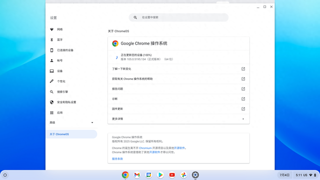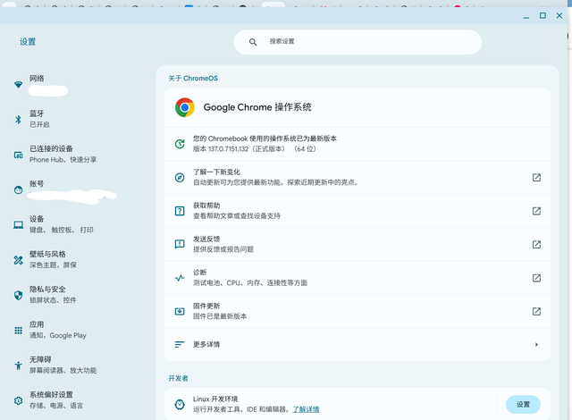 对网络环境要求很高在国内应用环境下生态为零(比如输入法就很难搞,还好现在有fyde开发的真文韵输入法)键盘布局少了 Delete,修改内容时候总得移动到后面或是按住 shift 选中再点 backspace虽然有安卓子系统,但是自行安装 apk 反而要开发者模式或者 Linux 下 adbLinux 子系统下输入法还得折腾 Linux 版的,api 改来改去二手 Chromebook 流通有限,大部分机器在贩子手中,价格相比二手 Windows 笔记本没什么优势我这台 Flex5 到手时候的系统版本是 70.XX,先升级到135然后又更新到最新的137,整个系统界面和功能都有不小的变化。