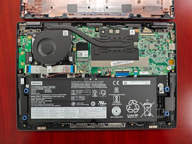 打开后盖可以看到 Flex5 采用单热管单风扇设计,主板部分是一眼看过去就便宜的绿色,不过整体做工也还算规整,作为一款原价在399美元左右的笔记本还是合格的。