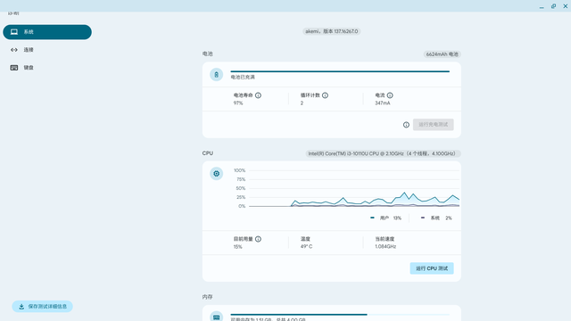 在设置-关于 Chroms OS-诊断选项中,可以看到这台 Flex5 的电池循环次数仅2次,可能是一台库存机器?
