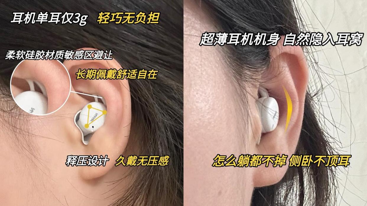 睡眠耳机需要长时间佩戴,对舒适度要求更高。机身最好贴合耳廓轮廓,重量尽量控制在3~6克左右,再搭配柔软亲肤材质与分压结构,让耳道受力更加均匀。这样无论侧躺、翻身还是整晚佩戴,都不容易出现硌耳、闷胀或松动滑落的情况,佩戴存在感也会更低,更有利于保持稳定睡眠。