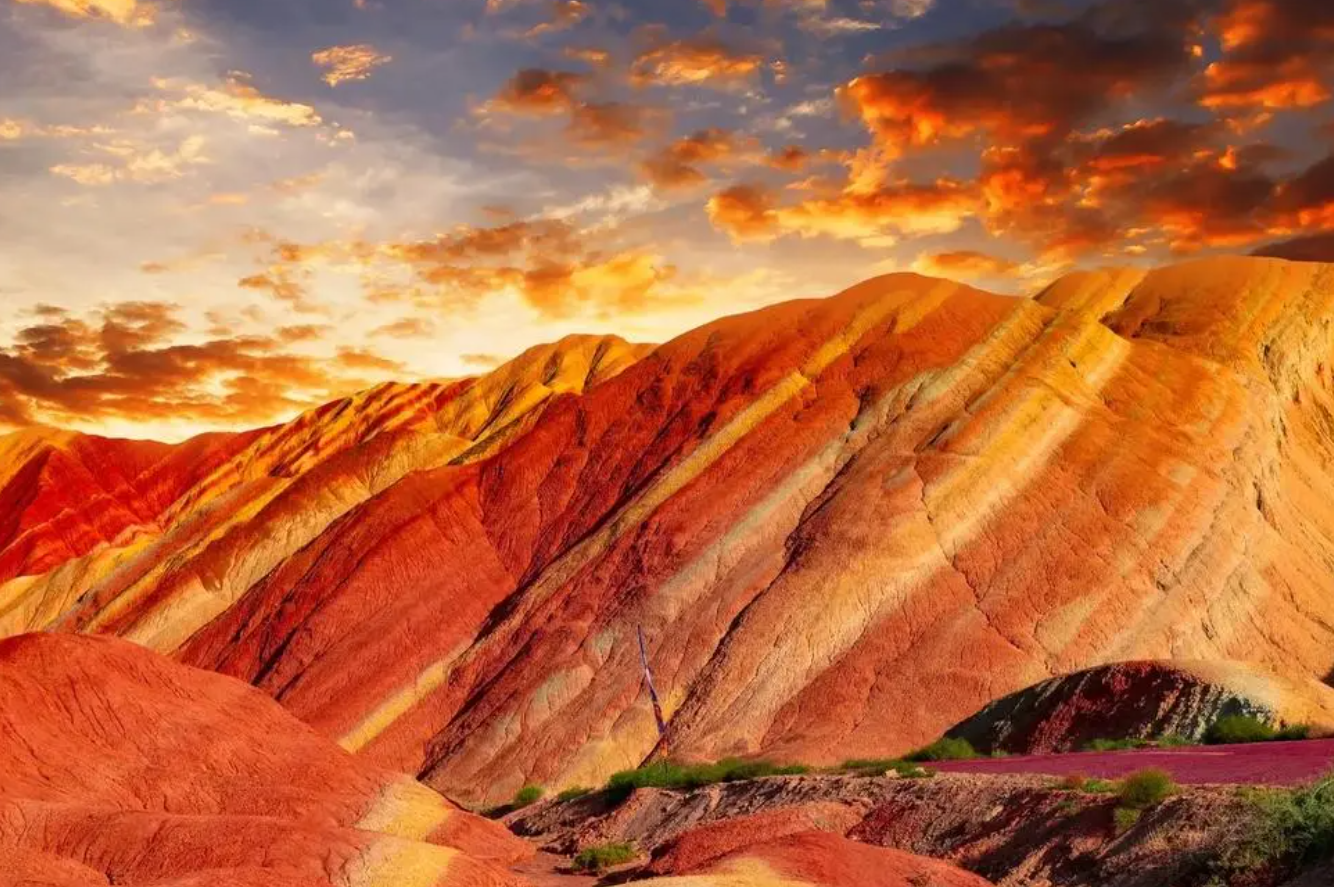 张掖丹霞,特别是七彩丹霞地质公园,宛如上帝打翻的调色板。许多摄影发烧友镜头下绚烂多彩的丹霞大片便是出自于此。如果你觉得这里的丹霞是“照骗”,远不及照片中那样绚丽,那可能是你去的时间不对。七彩丹霞最震撼人的色彩,在于黎明破晓时的灿若明霞,更在于黄昏时的变换无穷。日升日落霞光下的丹霞,红的如火,黄的似金,灰的如钢,线条分明,瑰丽而浪漫。蓝天、白云、山峰、丹霞,构成了张掖最惊艳的风景。