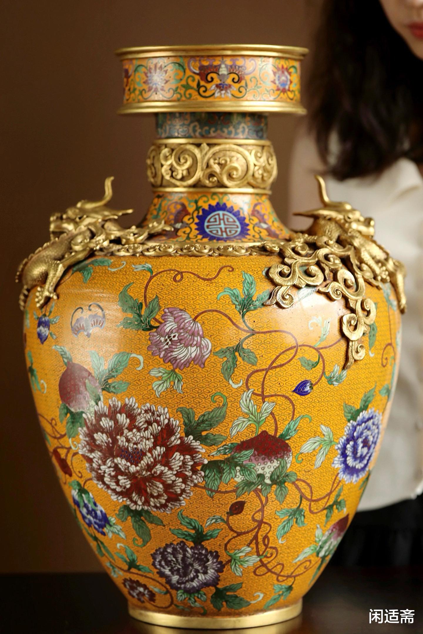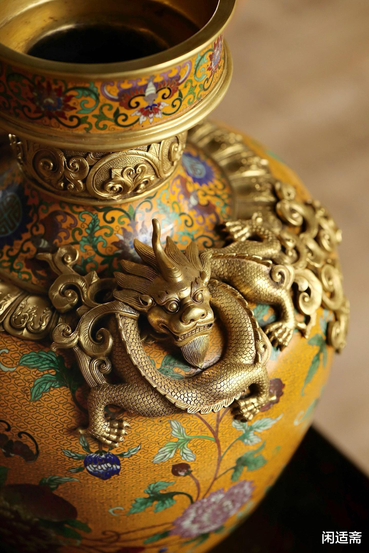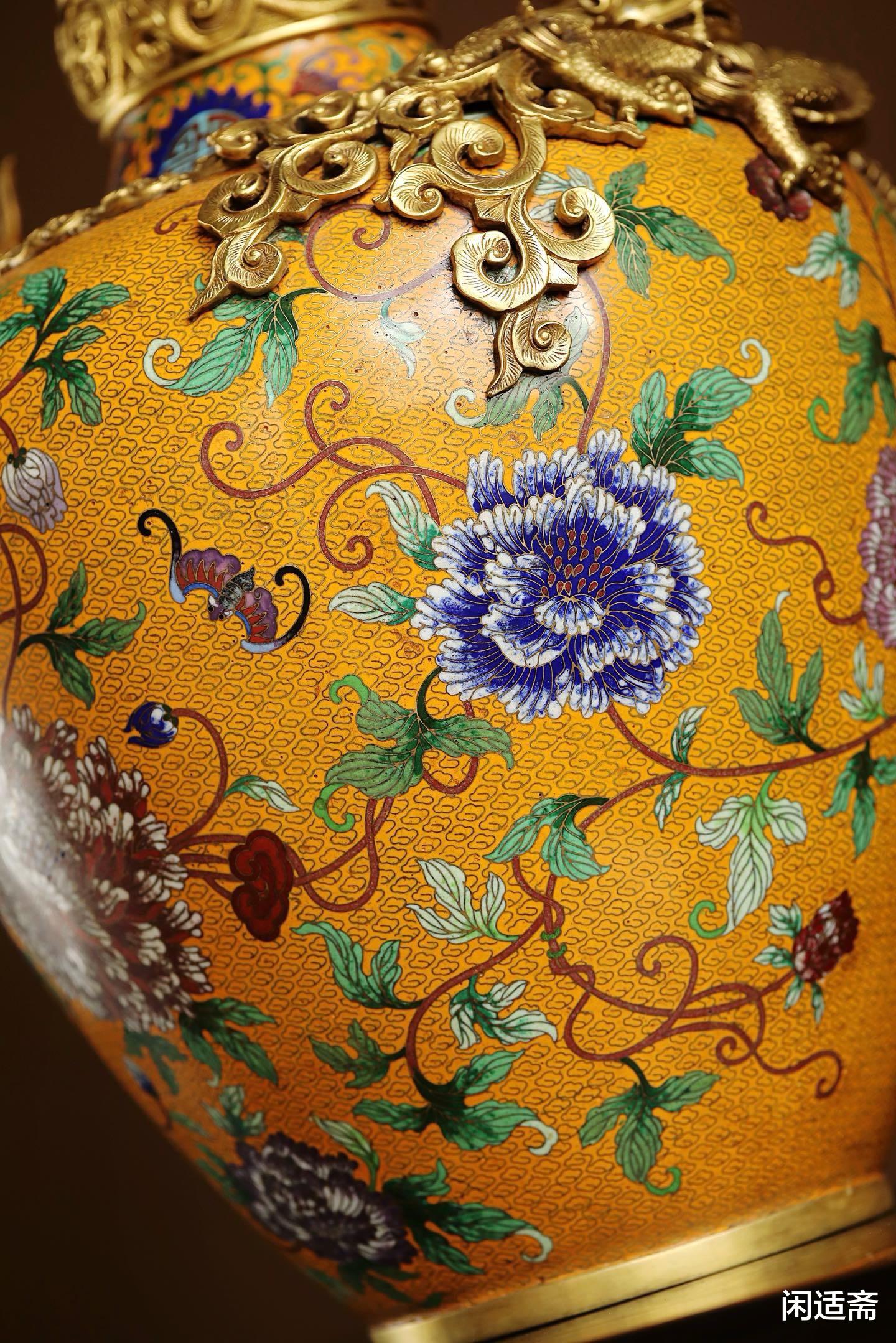 瓶身细节处更见匠心:瓶颈与瓶口的纹饰以细密的金属丝编织而成,或为缠枝莲纹,或为回纹,线条灵动如跳跃的音符,奏响着古典美学的韵律;鎏金的边缘经过精心打磨,在光线下闪耀着温润的贵气,既中和了釉色的艳丽,又与瓶身的珐琅彩形成 “金与彩” 的完美呼应,让整体更显精致奢华。