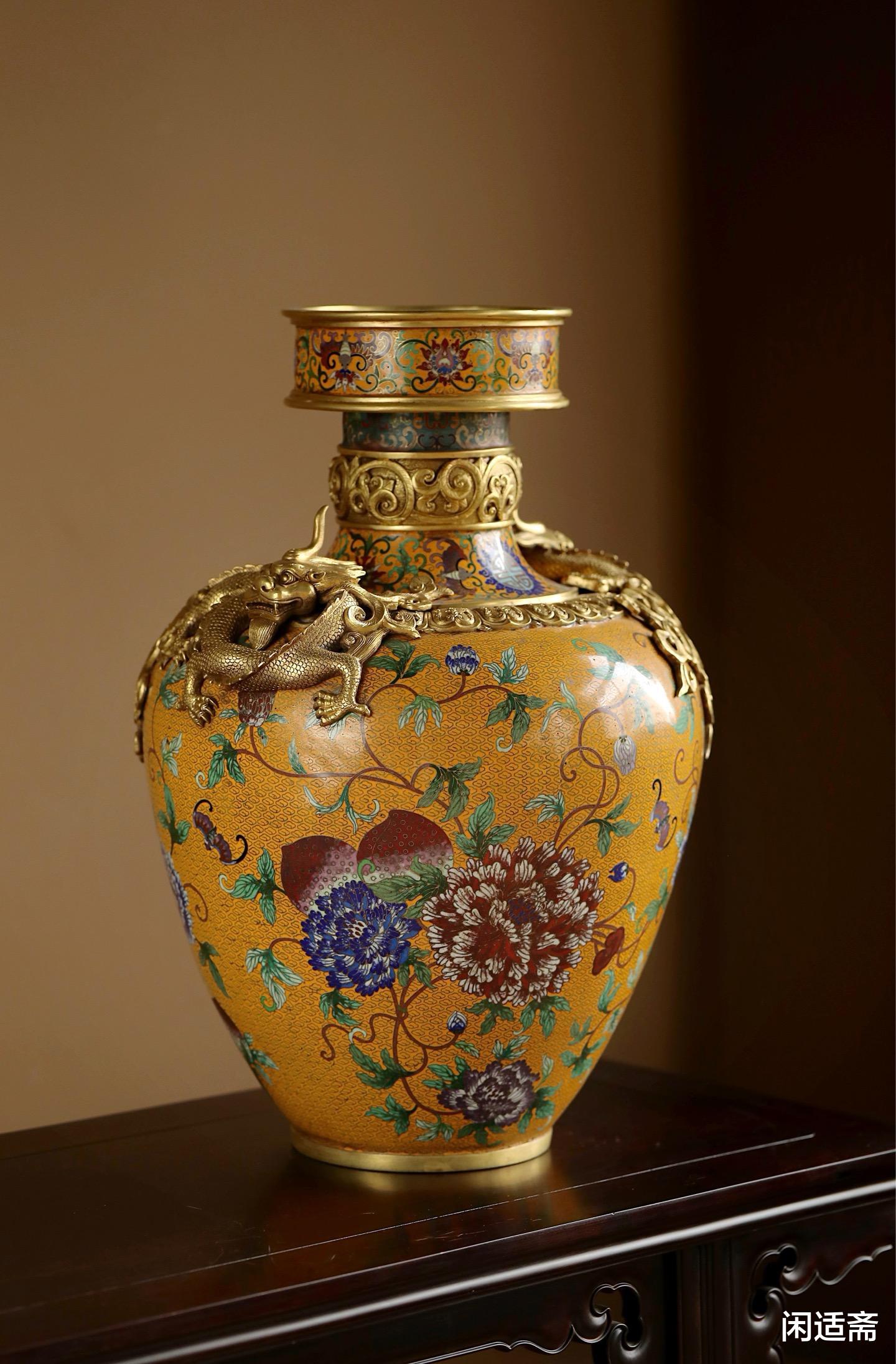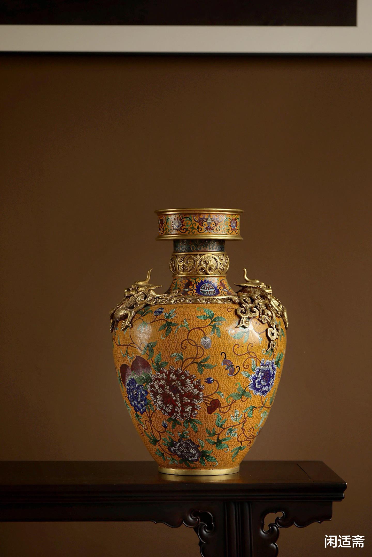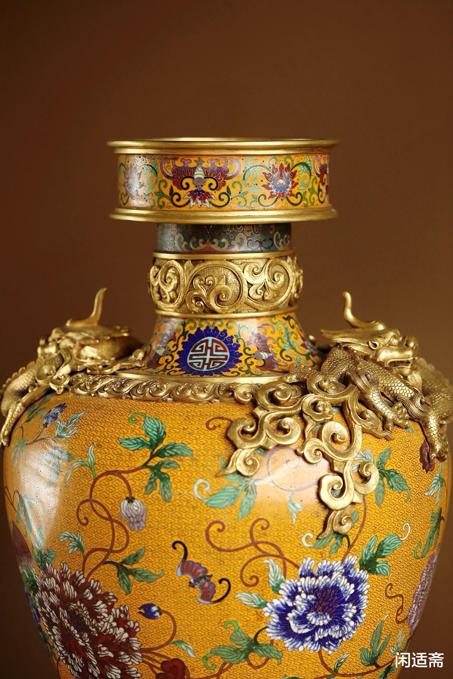 瓶身细节处更见匠心:瓶颈与瓶口的纹饰以细密的金属丝编织而成,或为缠枝莲纹,或为回纹,线条灵动如跳跃的音符,奏响着古典美学的韵律;鎏金的边缘经过精心打磨,在光线下闪耀着温润的贵气,既中和了釉色的艳丽,又与瓶身的珐琅彩形成 “金与彩” 的完美呼应,让整体更显精致奢华。