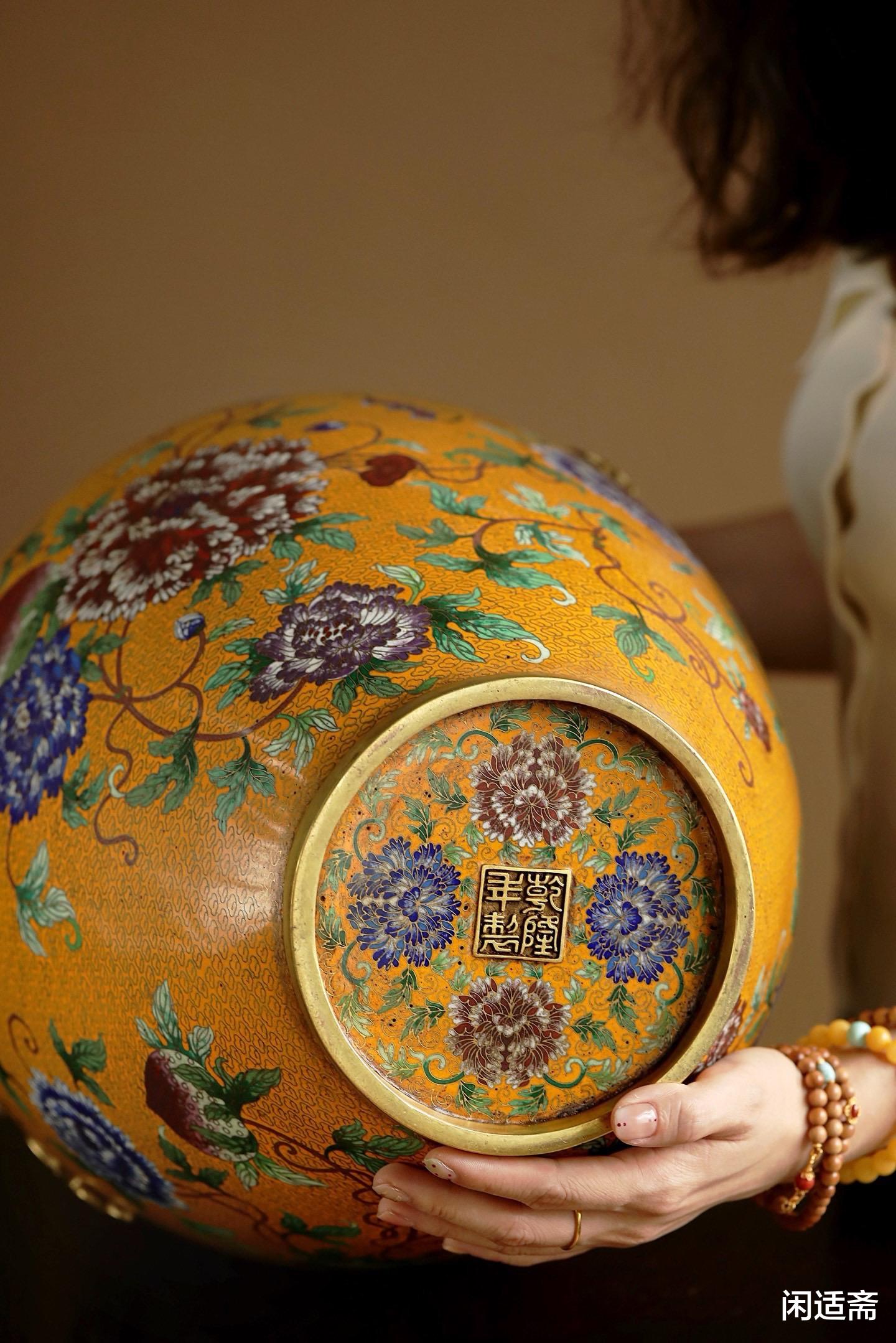 此件掐丝珐琅藏草瓶瓶身以尊贵的明黄色为基调,一如明清宫廷器物的雍容气度,却又在色彩运用上注入现代审美,其上,一朵朵形态各异的花卉在掐丝与釉料的勾勒下竞相绽放 —— 牡丹花瓣层叠饱满,釉色从浅粉过渡到艳红,尽显雍容华贵;芍药花瓣边缘微卷,以柔粉与莹白交织,勾勒出妩媚娇柔的姿态;兰花则以淡雅的浅蓝与青绿为主,叶片修长舒展,透着清幽雅致的气韵。每一朵花的形态都栩栩如生,仿佛能嗅到花香,触到花瓣的柔润。