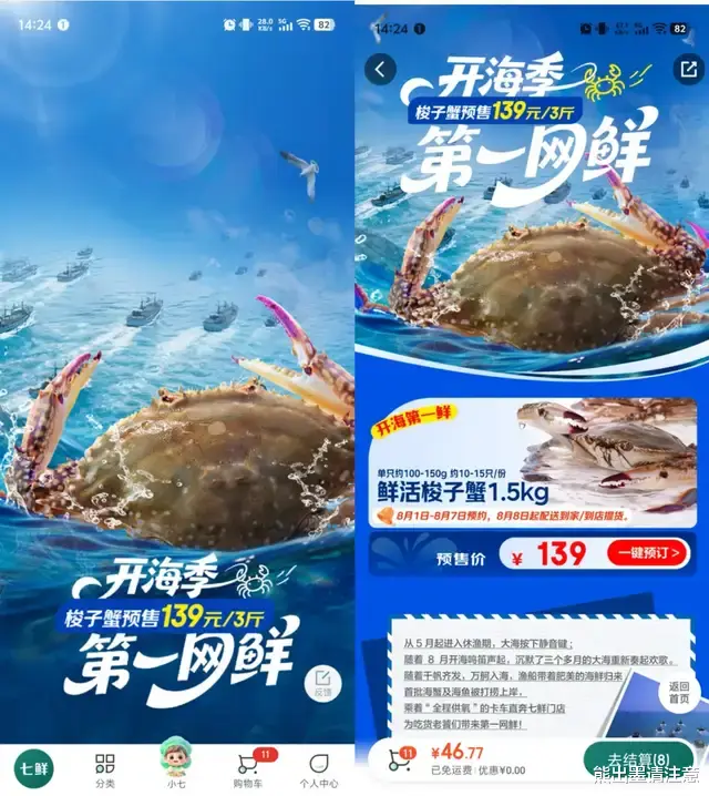 再往前几天,真正的老饕应该关注到了京东七鲜开海季特惠预售,139元整整3斤鲜活梭子蟹,8月1日-8月7日预售下单,8月8日配送到家或者门店自提。熊出墨发现,在8月5日、6日部分七鲜门店的预售库存已经提前售罄,这也符合从七鲜相关人士得到的信息,“第一天就卖爆了,整体超出了原定目标”。