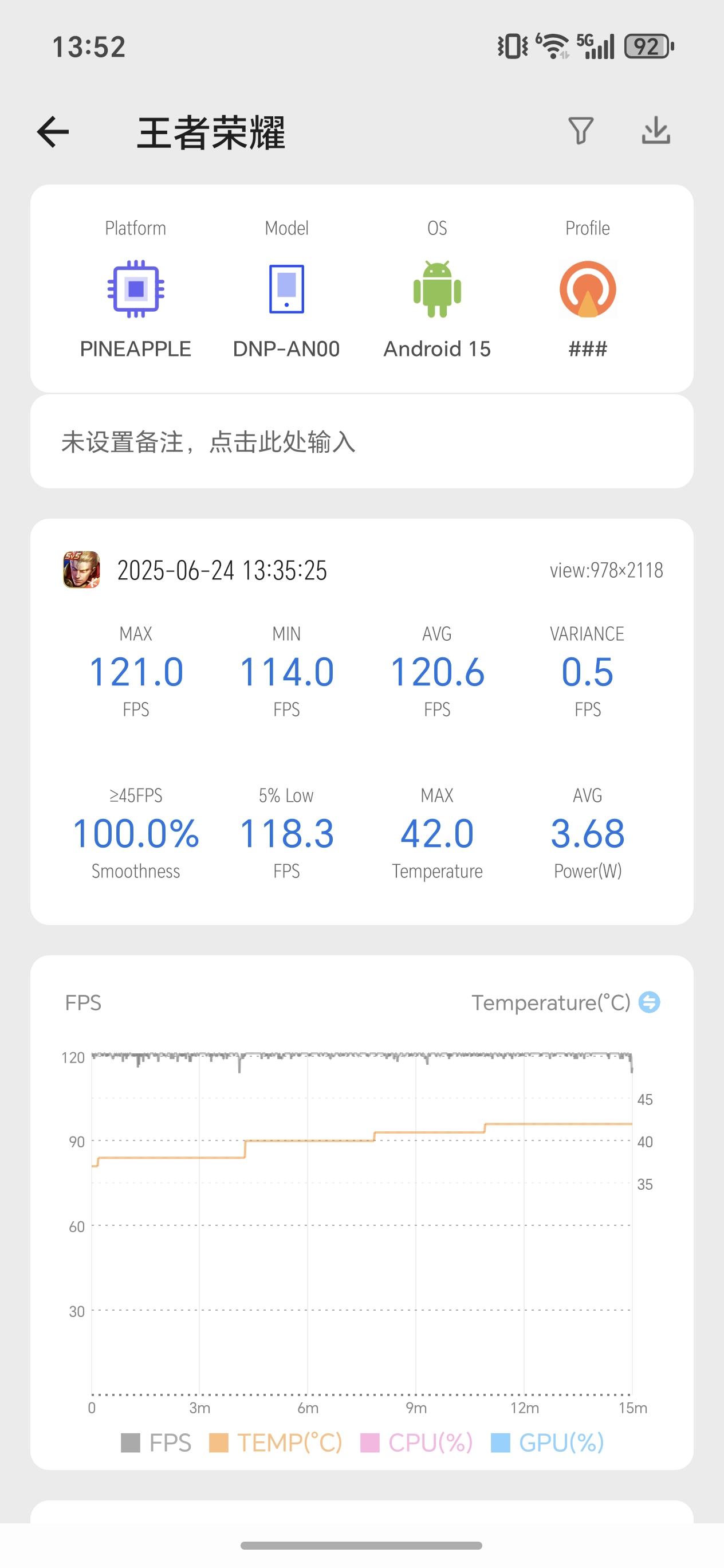 从帧率记录看,荣耀400 Pro的帧率几乎稳定在一条直线,基本没有波动,整场游戏平均帧率120.6,得益于第三代骁龙8先进的4nm工艺和能效架构加持,在游戏中功耗也仅有3.68W左右,一场游戏下来手机也没有出现明显的发热情况。