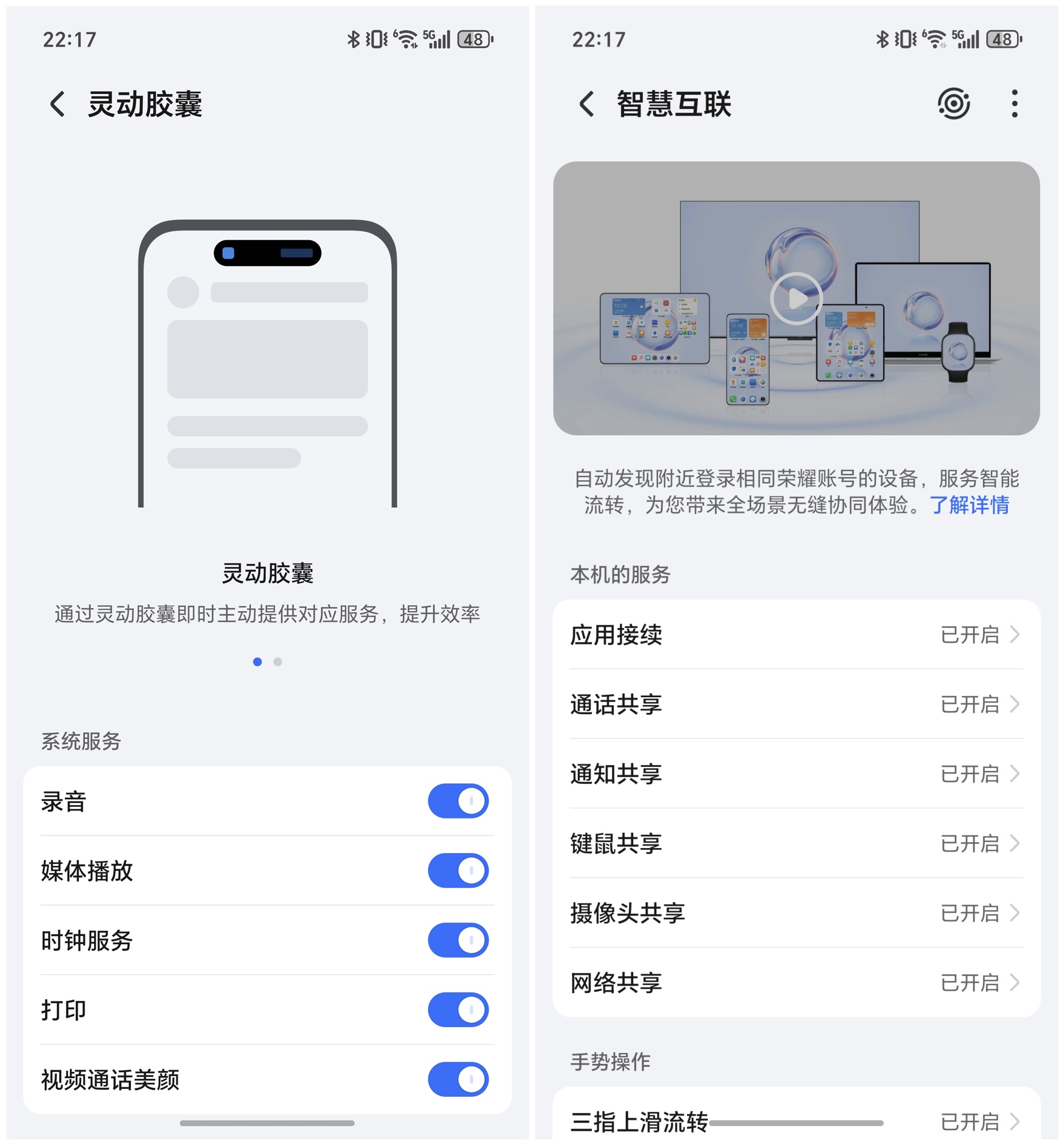 荣耀400 Pro搭载最新的MagicOS 9.0操作系统,使用时可以发现其借鉴并优化了多项主流UI设计元素。分离式下拉通知栏的设计理念与主流安卓系统类似,但针对我们的用户习惯进行了优化;高斯模糊的视觉效果处理方式与iOS系统有相似之处,但渡动画和细节处理上有所差异;灵动胶囊的交互方式虽然与某些厂商的解决方案类似,但在多任务切换和状态显示方面进行了功能强化;智慧互联则可实现全场景无缝协同体验。