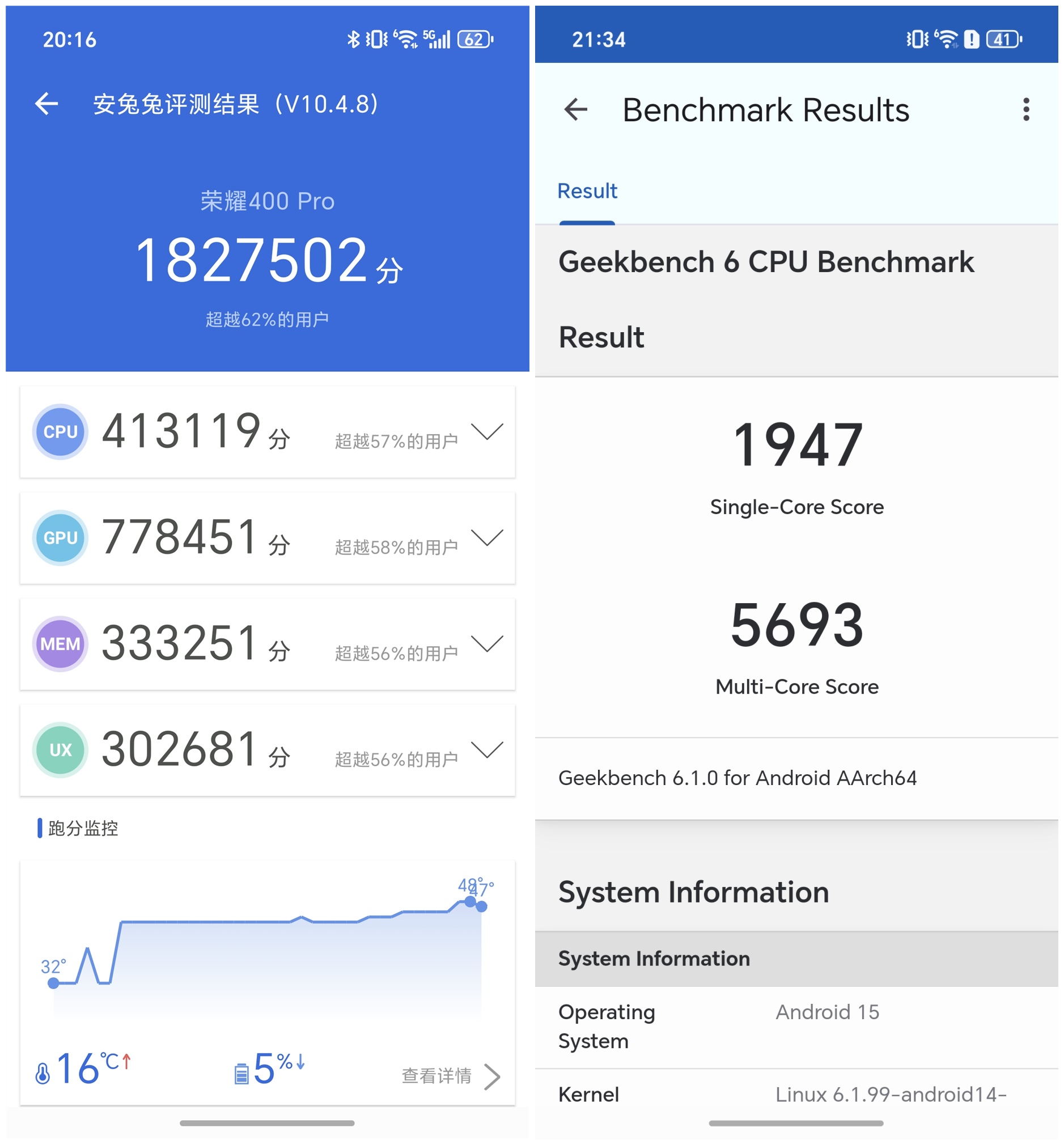 荣耀400 Pro此次性能跃升的核心驱动力,毫无疑问是其搭载的满血版第三代骁龙8移动平台。这颗旗舰芯以高达3.3GHz的峰值主频全力释放,为其提供了澎湃的算力。同时荣耀400 Pro为其配备了满血版LPDDR5X内存+UFS 4.0高速存储,三者共同构建了“性能铁三角”。实测安兔兔跑分182万(CPU:413119分,GPU:778451分,MEM:333251分,UX:302681分),Geekbench6中单核1947多核5693。