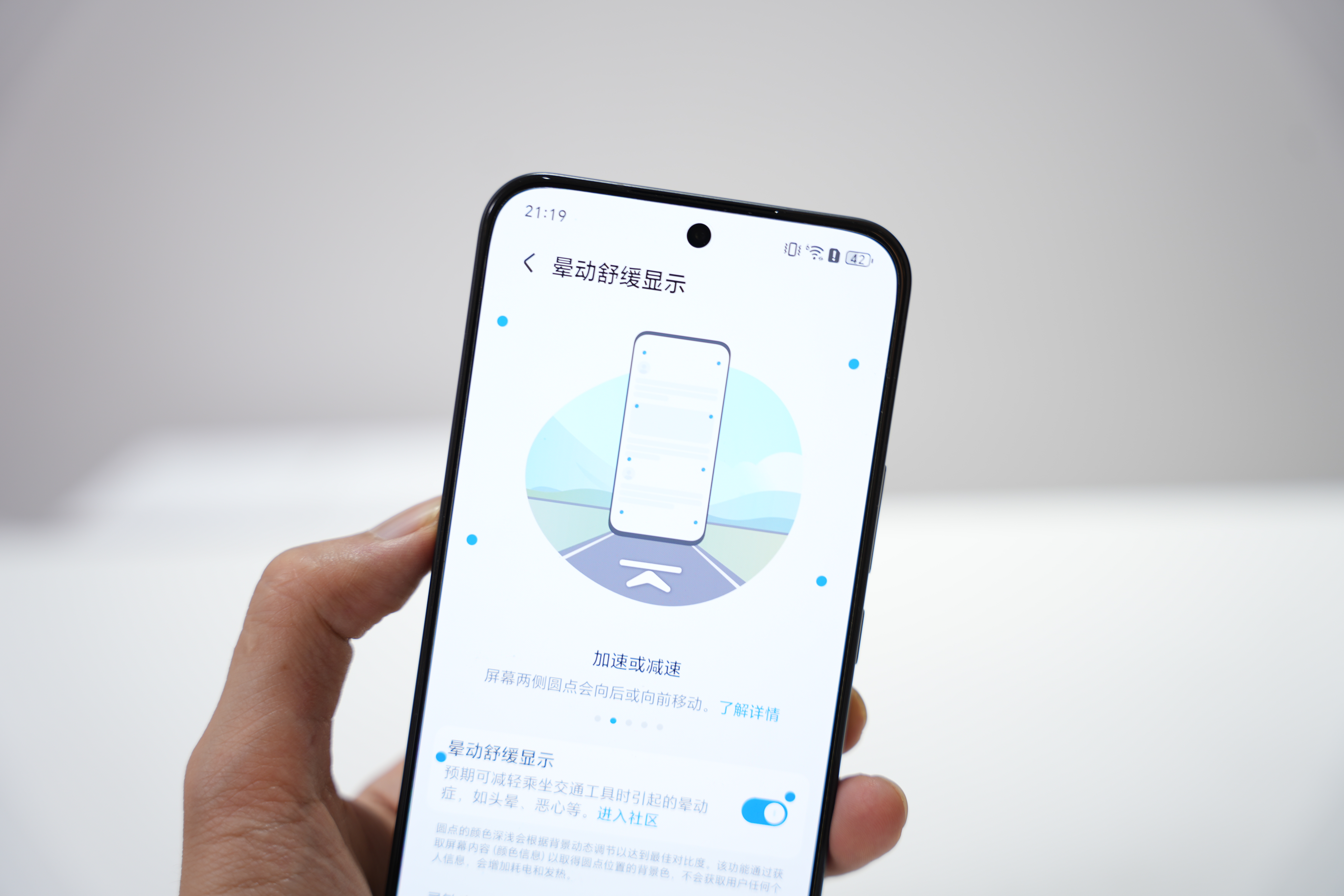 对于经常通勤的用户来说,坐地铁或者公交时,开启晕动舒缓显示功能就能有效缓解晕车的状况,激活后在屏幕两侧呈现动态标识点,该功能通过实时感应车辆加速度方向,使标识点产生反向位移进行视觉补偿,这对容易晕车的人来说十分的友好。