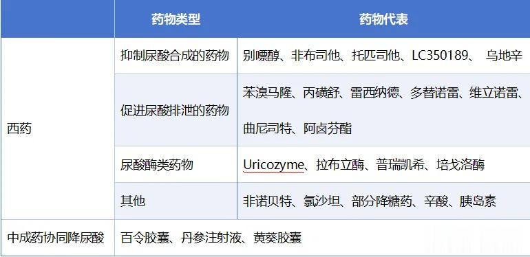除了生活方式的干预,就是用药了。关于降尿酸治疗的中西用药,小编进行了如下整理: