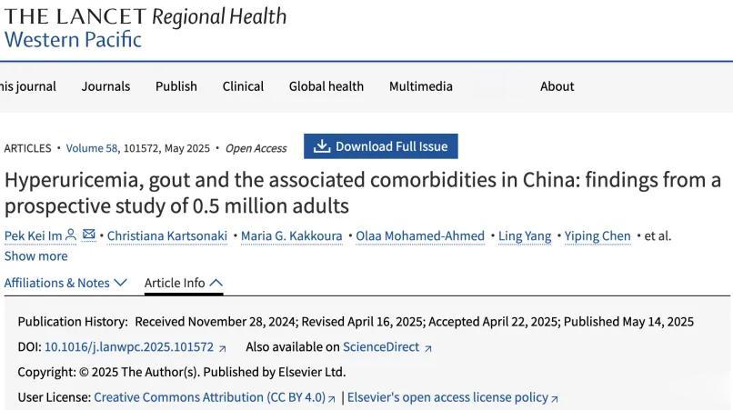[1]Im PK, Kartsonaki C, Kakkoura MG, et al. Hyperuricemia, gout and comorbidities in China: a prospective study of 0.5 million adults. Lancet Reg Health West Pac. 2025;58:101572.