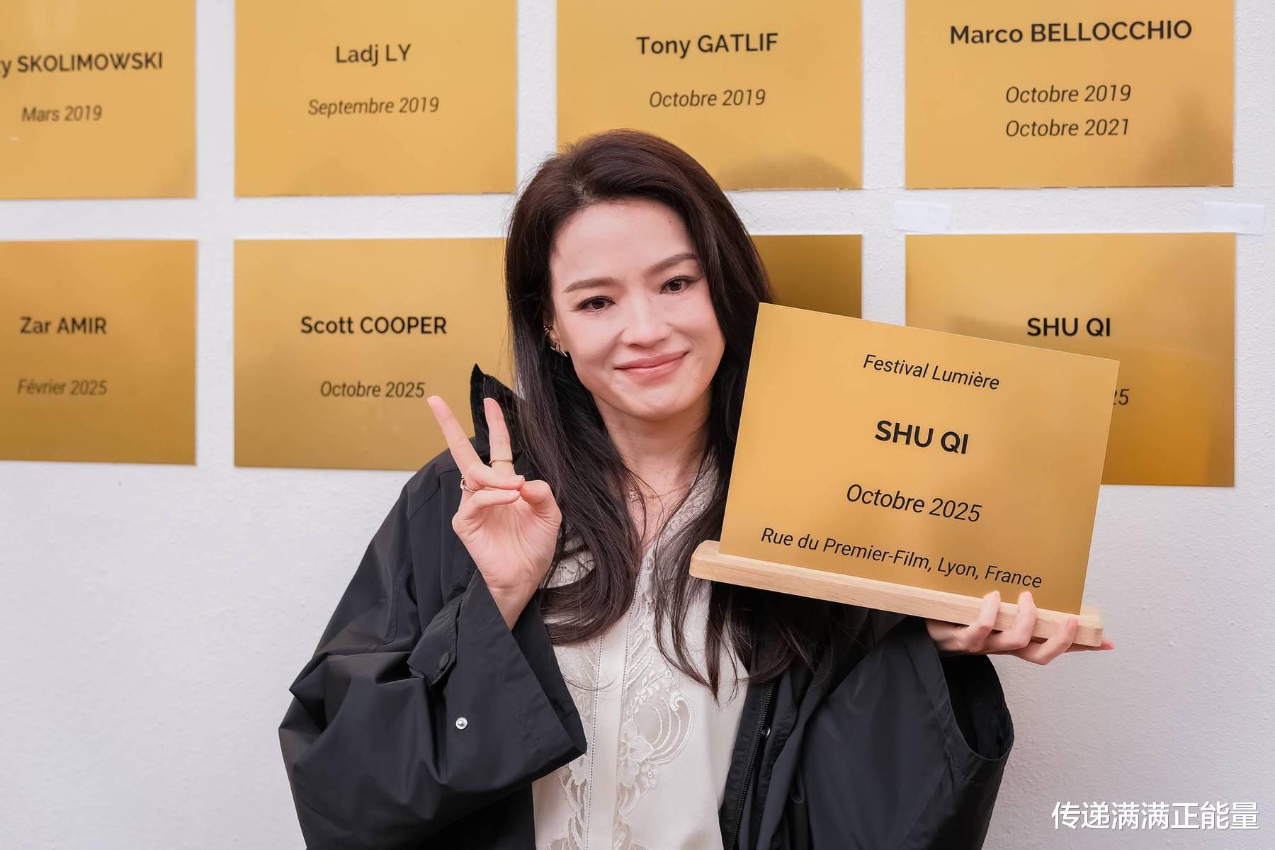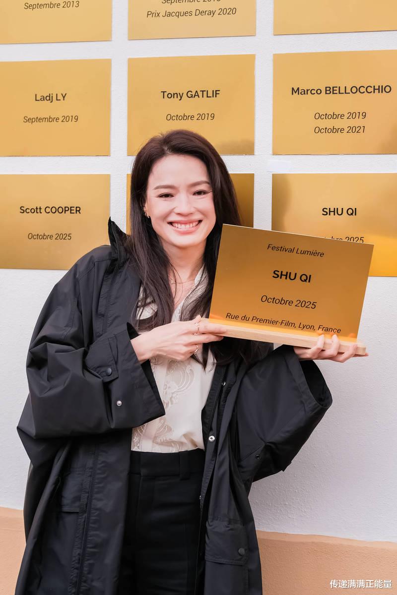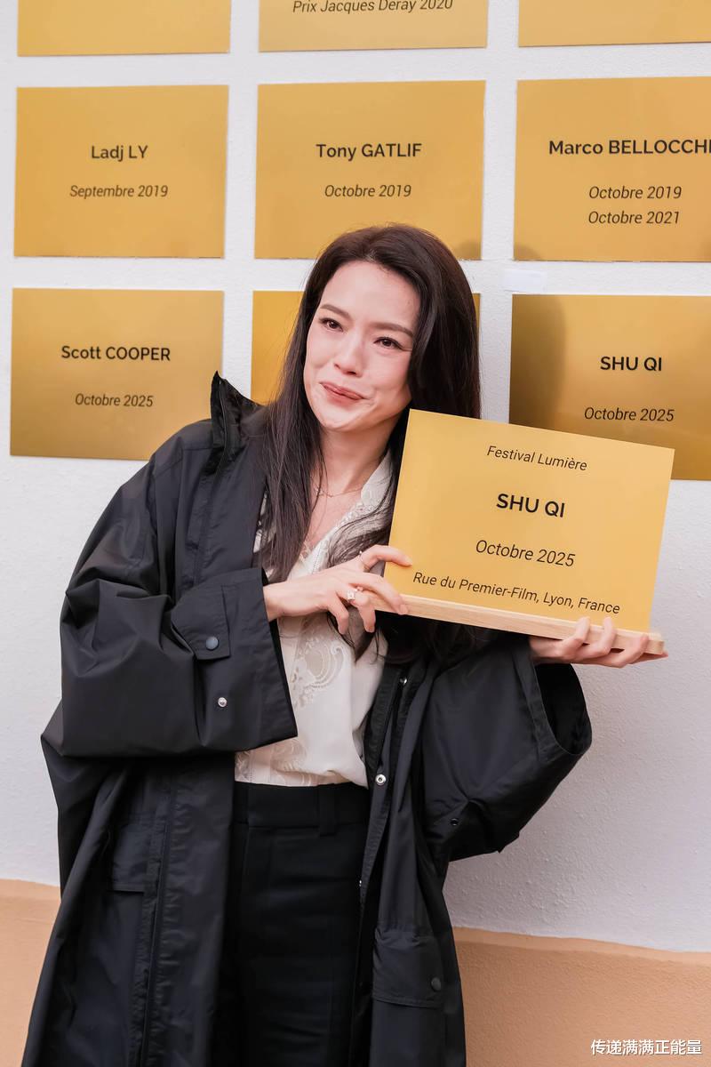 看到舒淇在卢米埃尔电影节上的照片,她穿一件黑色皮衣,整个人气场全开。照片里她手捧纪念牌,还俏皮地比了个耶,笑容特别灿烂。我一下子就被吸引住了,这不只是时尚,更像她在说“这就是我”。