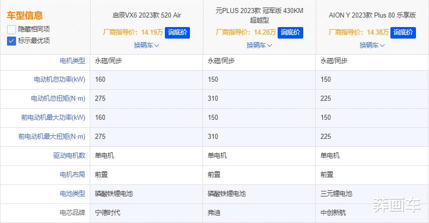 动力方面,三款车型差距不大,总体来看启辰VX60的功率更大,元PLUS的扭矩更大,AION Y动力最弱但能换取更长的续航。值得一提的是,AION Y有续航510km的版本,售价也是在14.18万元,换来的是更丰富的配置。