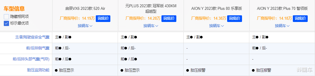 配置方面,最主要的是主/被动安全配置,其中元PLUS搭载L2级别辅助驾驶,全速自适应续航;而AION Y的安全气囊最少。