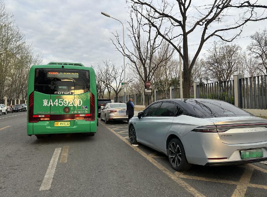 3月29日至4月1日早上,记者在京洲北二街发现多起车辆违停。有车辆占据了公交车停靠站和通学车位,迫使公交车和通学车辆在机动车道上下客,造成后方车辆积压。