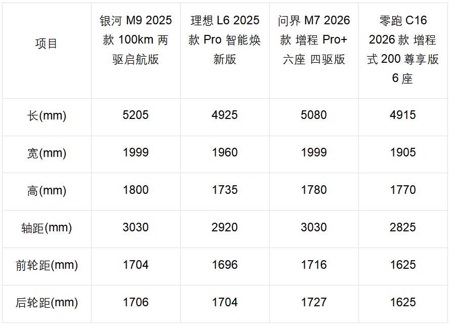 咱开车出去耍,车里头空间宽敞不宽敞,对坐车的感受影响可大了去了!你想啊,谁愿意在车里挤得腿都伸不直,身子扭来扭去都转不过弯,难受得要命啊!这车空间大不大,其实就俩关键点。一个是车本身得够大;再一个就是车里头内饰得安排得合理,就跟搭积木似的,得搭得规规矩矩、舒舒服服的,这样咱坐进去才舒坦。咱们先来看看理想L6、银河M9、问界M7还有零跑C16这四款车,看看它们到底谁更能“装”!通过数据对比,直观感受一下!