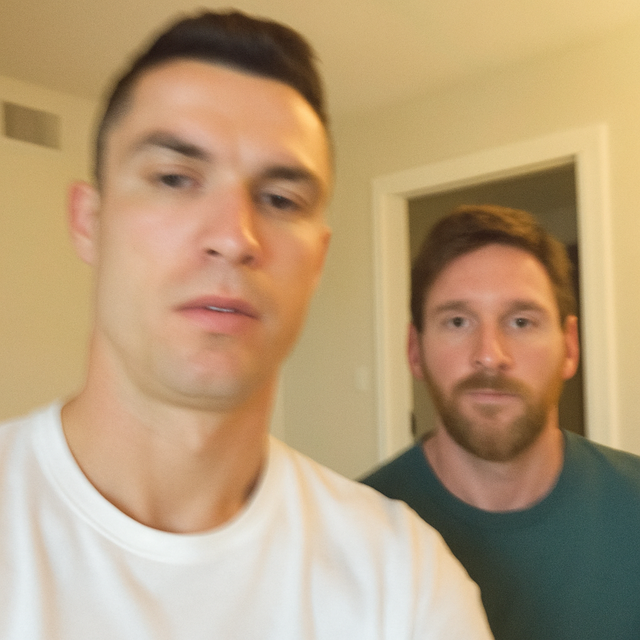 输入的提示词:请你生成张极其平凡无奇的自拍照,没有明确的主体或者构图感,就是随手一拍的快照,照片略带运动模糊,阳光或室内打光不均导致的轻微曝光过度,整体呈现出一种刻意的平庸感,就像是不小心拍到的一张自拍,主角是守望先锋里的 C 罗,旁边是梅西。
