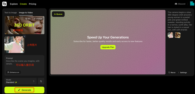 Higgsfield 的玩法非常简单,只需选择一种运镜模版,比如「360 Orbit」(360 度环绕)运镜,再上传一张人物照片。