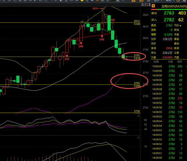 技术指标:今日豆粕2605合约维持在近期震荡区间内。夜盘预计延续区间整理,等待消息面指引。价格运行于20日线与60日线之间,短期震荡格局明确,无明显单边趋势。60分钟RSI升至52(中性区间),多空动能相对均衡;5分钟级别在2778-2788区间整理,短期依托2770元/吨形成支撑,反弹力度受南美丰产预期制约。