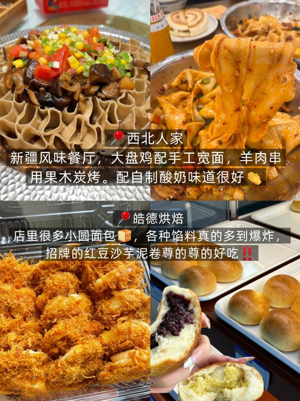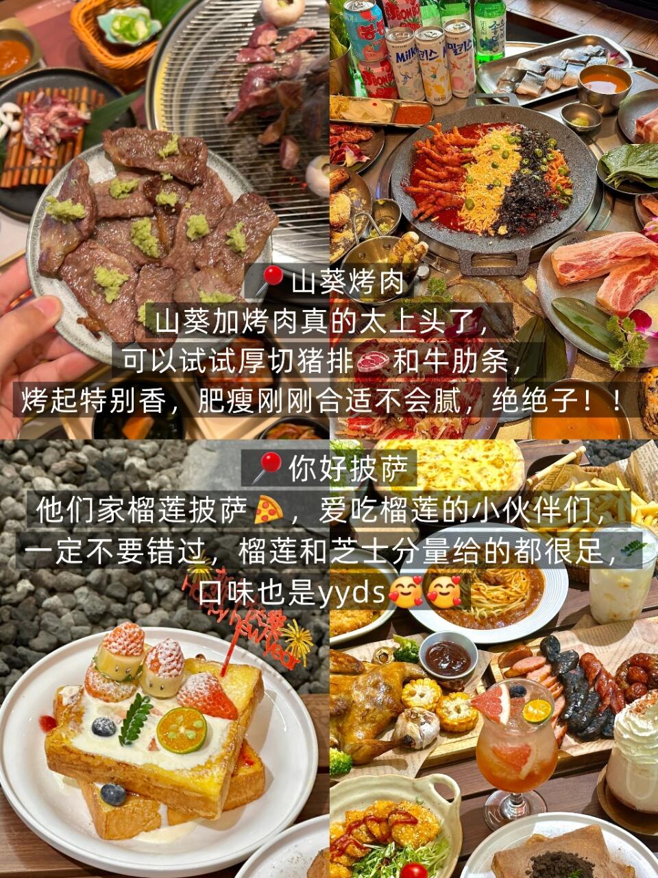 🥩山葵烤肉的厚切猪排和牛肋条必须点,山葵的清新中和了烤肉的油腻,烤得滋滋冒油超解馋;🍕你好披萨的榴莲披萨料超足,榴莲果肉混着拉丝芝士,爱吃榴莲的宝子直接冲🍕!🍜西北人家的大盘鸡配手工宽面,吸满汤汁的面条裹着浓郁酱香,再啃一块软烂的鸡肉,香到跺脚~