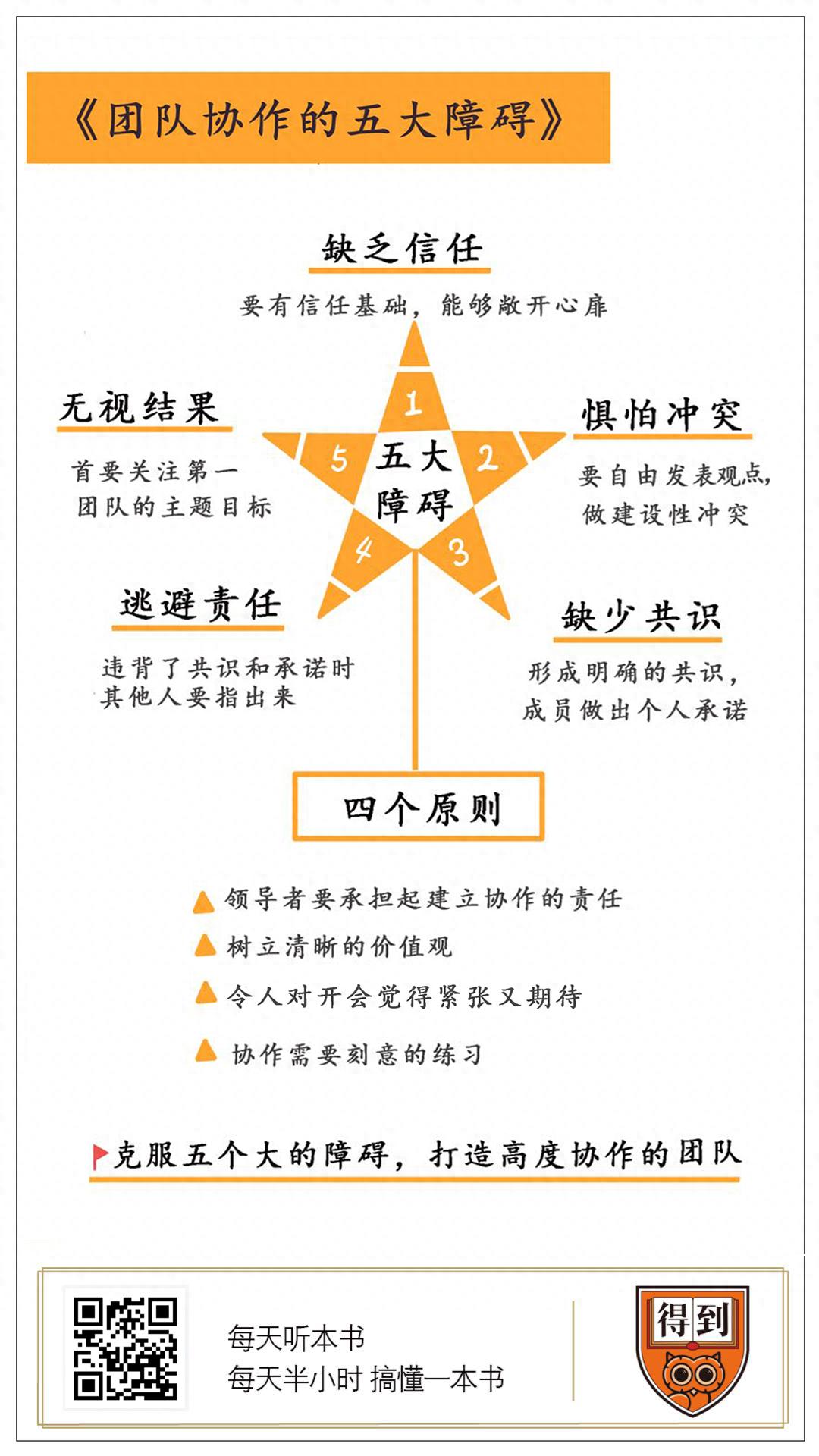 这本书用一个故事,讲述了团队协作过程中经常遇到的五大障碍,也就是缺乏信任、惧怕冲突、缺少共识、逃避责任、无视结果。那一个有效协作的团队是什么样呢?要有信任基础,能够敞开心扉;要自由发表观点,做建设性冲突;要及时形成明确的共识,成员做出个人承诺;当某个人违背了共识和承诺,其他人要给他指出来;最后,成员应该首要关注第一团队的主题目标。这需要领导以身作则,承担责任,树立清晰的价值观,在开会上做足文章,然后带领团队反复练习,来克服这五大障碍。