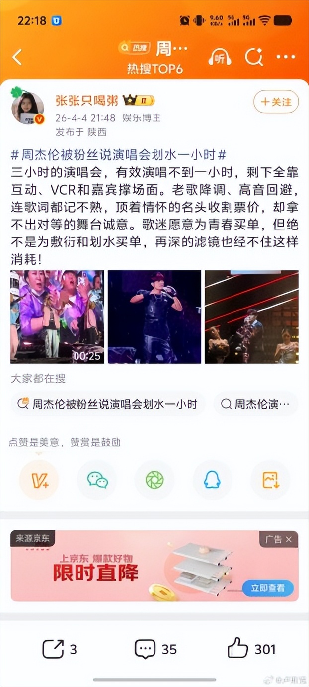 事件的起因非常具体:多名现场观众反映,在长达三小时的演出中,周杰伦本人的实际演唱时间被严重压缩。大量的时间被分给了点歌环节、伴舞表演、助阵嘉宾的帮唱,甚至是现场的互动聊天。对于花了几千元买票、跨越几百公里只为听偶像唱歌的粉丝来说,这种“含伦量”极低的表演,无异于一场包装精美的“视觉欺诈”。