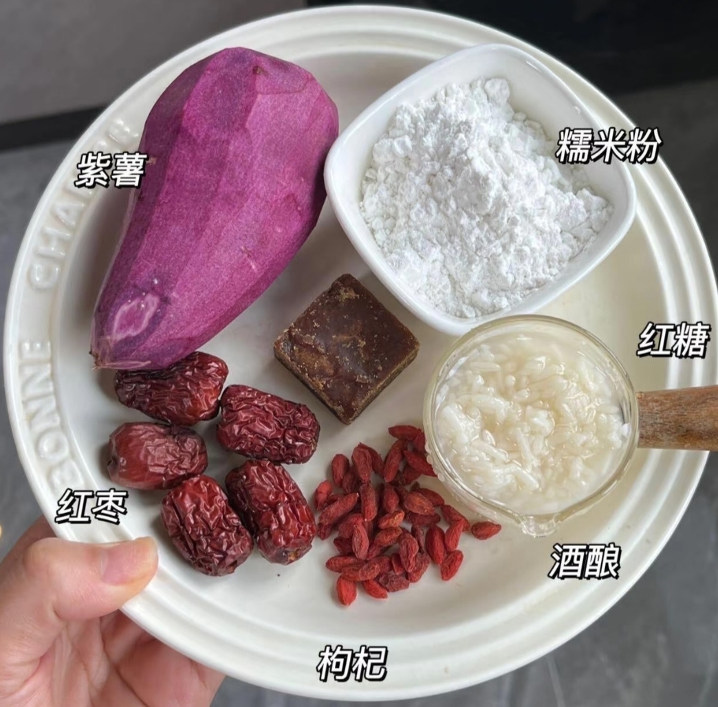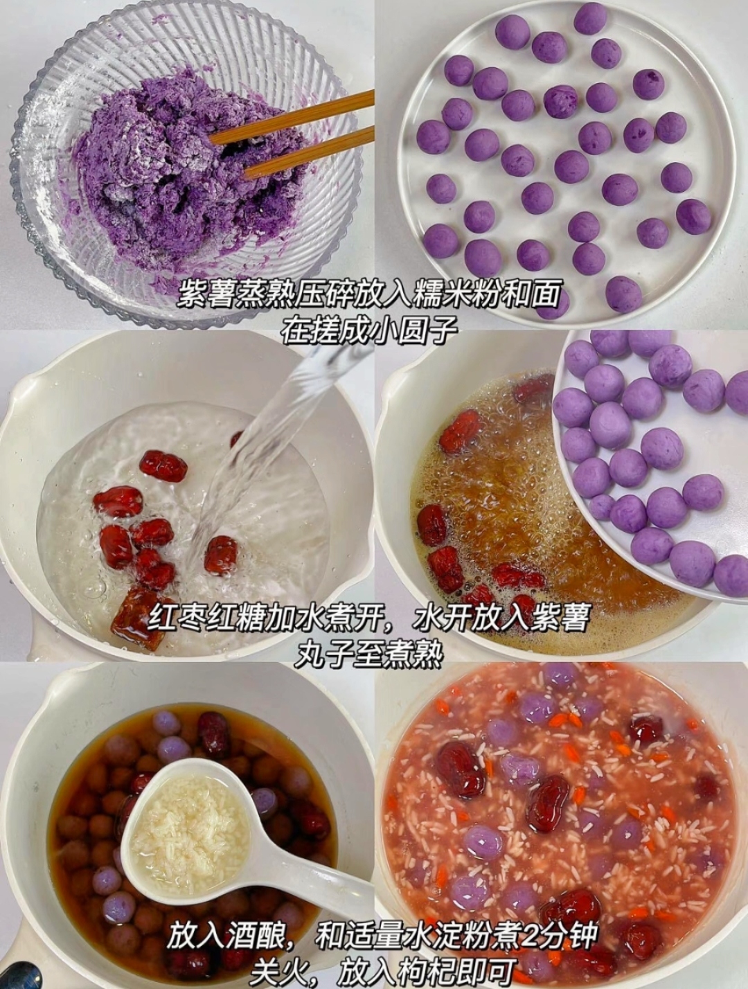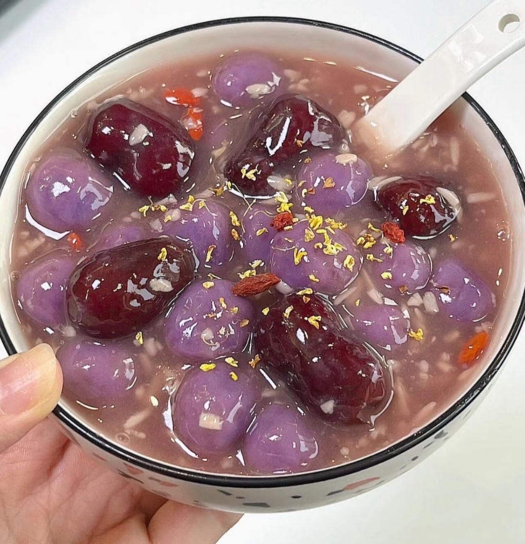 深口瓷碗先装丸子,再浇红汤,最后撒枸杞点缀。勺子插中间,紫色丸子浮起,像mini星球泡玫瑰浴。第一口先喝热汤,甜里带淡淡酒香,喉咙瞬间打开;第二口咬丸子,软糯拉丝,紫薯颗粒在齿间蹦迪;第三口把红枣对半切开,果肉吸饱汤汁,比鲜枣还甜。一碗下肚,手心冒汗,脚尖发烫,脸上自带腮红滤镜,谁还看得出你昨晚三点睡!