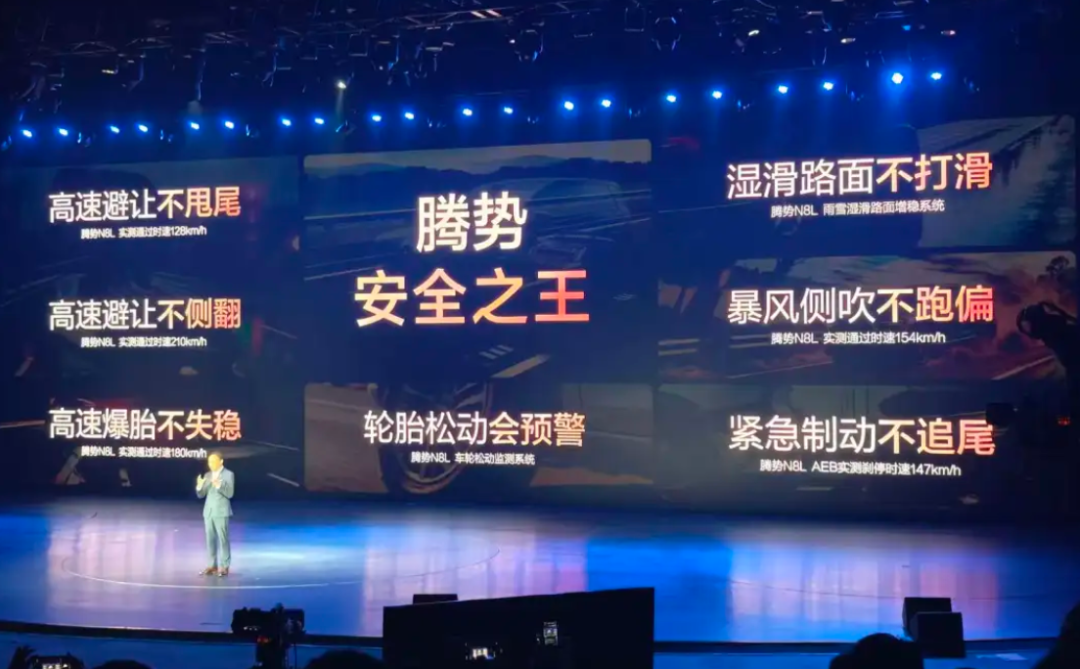 譬如,腾势N8L能够以128km/h高速避让不甩尾、210km/h高速避让(鱼钩测试)不侧翻、180km/h高速爆胎不失稳、154km/h暴风侧吹不跑偏、147km/h AEB自动紧急制动、不怕雨雪路面打滑、车轮松动监测系统,以科技安全守护最安全底线,是当仁不让的新能源汽车“安全之王”。