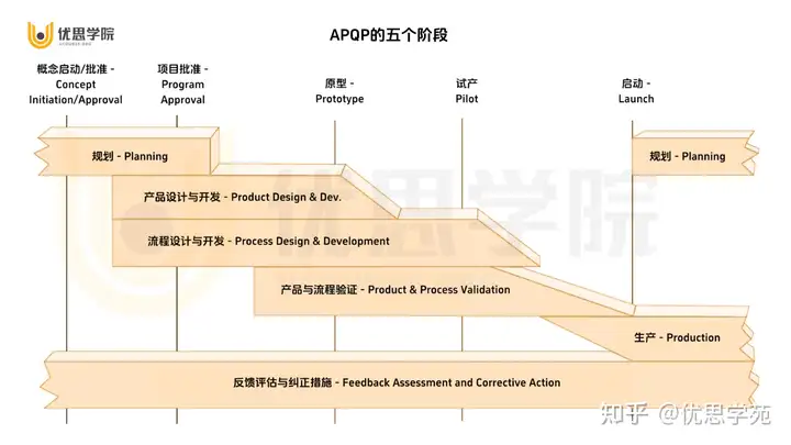 APQP是一种结构化的产品及过程设计开发方法,内容上包括5个在时间上有叠加的步骤,其核心目的是通过一系列工具或方法来降低产品及过程的风险,如下图所示: