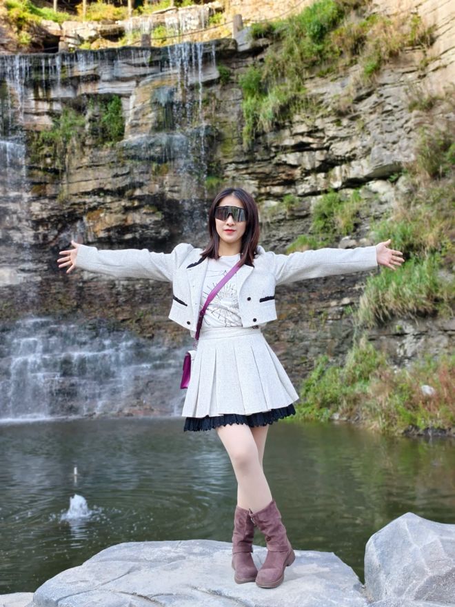瀑布从崖壁轰鸣而下,溅起的水汽在阳光下折射出虹光。站在水边岩石上,浅米色套装被水汽晕染得愈发清新。此刻,套装的轻盈与瀑布的磅礴形成奇妙对话:衣料的柔糯承接了水花的灵动,百褶裙的起伏呼应着水流的跌宕。张开双臂时,衣袖如翅膀般舒展,仿佛要与瀑布的水汽一同飞舞,此时的穿搭,已然是自然伟力中一抹柔美的注脚,既不张扬,却又清晰标注着人与自然的交融。