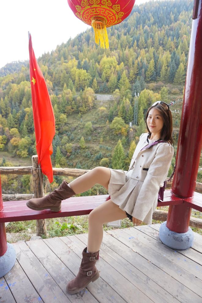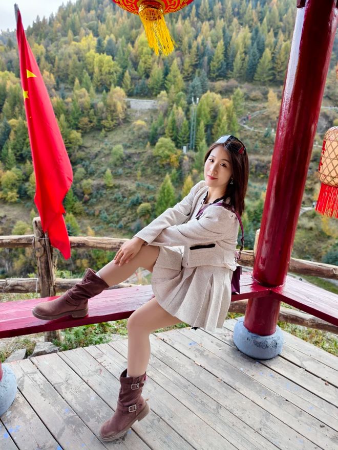 行至山间朱红的亭阁,烫金灯笼与国旗在风里轻晃,古意扑面而来。浅米色套装在此刻更显温润,它中和了红色的浓烈,如同一幅水墨画里的留白,让视觉有了呼吸的空间。坐在朱红长椅上,裙摆自然垂落,与亭阁木质纹理、灯笼流苏的轻晃相映成趣,仿佛穿搭也沾染了亭阁的古朴,成了时光里一段温柔的注脚。