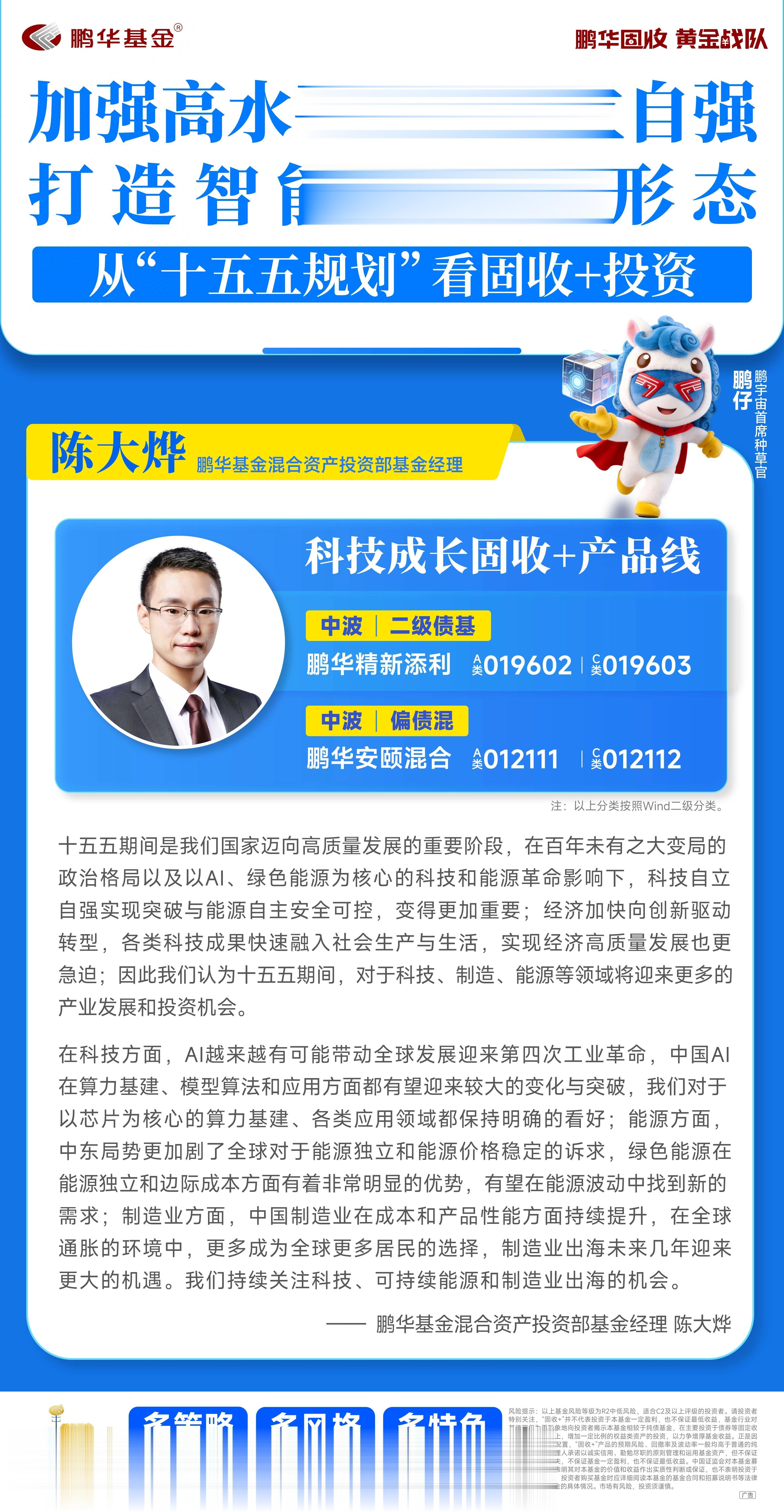 在这一轮科技革命与产业变革深度交织的时代背景下,鹏华基金混合资产投资部基金经理陈大烨分享了最新投资观点。他认为,在百年未有之大变局的政治格局以及以AI、绿色能源为核心的科技和能源革命影响下,科技自立自强实现突破与能源自主安全可控,变得更加重要。经济加快向创新驱动转型,各类科技成果快速融入社会生产与生活,实现经济高质量发展也更急迫。据此判断,“十五五”期间,科技、制造、能源等领域将迎来更多的产业发展和投资机会。