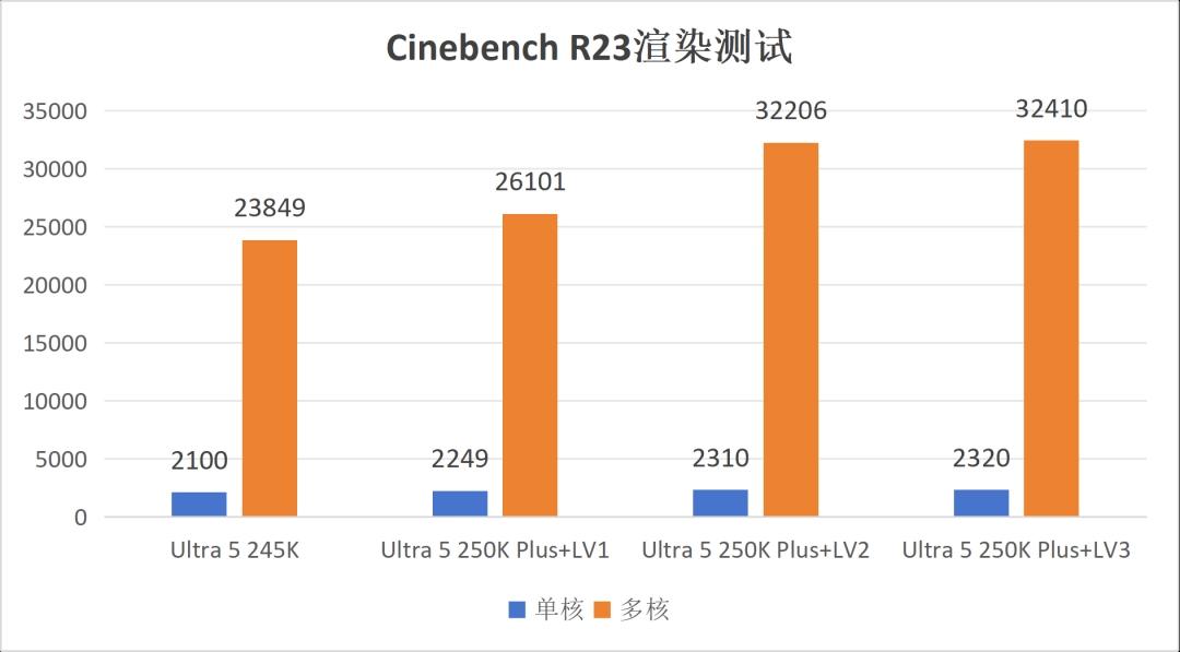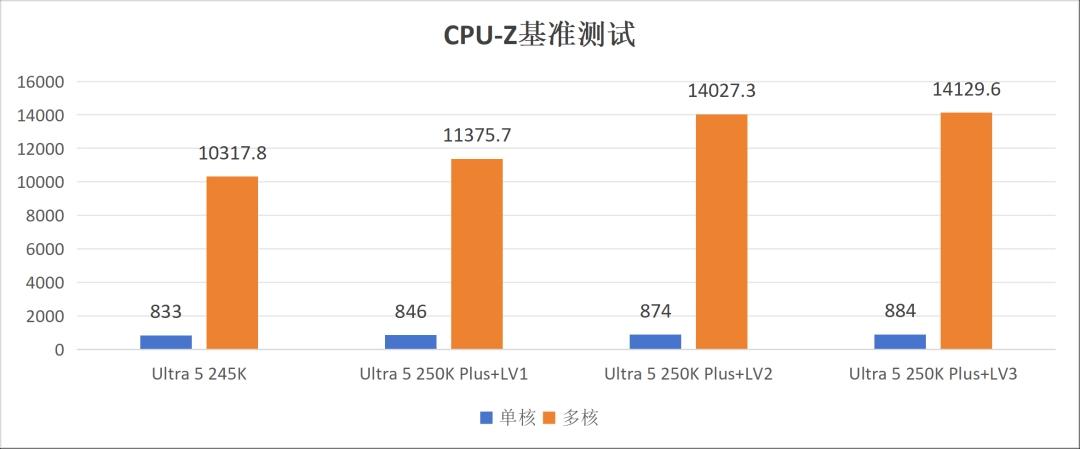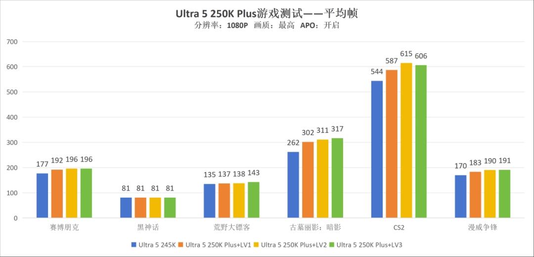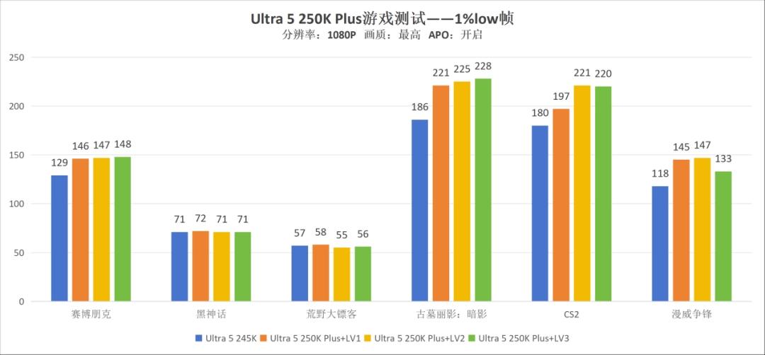 实测数据验证了这三档的价值。搭配酷睿Ultra 5 250K Plus和技嘉AORUS RTX 5080超级雕显卡,在1080P最高画质关闭光追和DLSS的条件下,Cinebench R23中默认LV1档多核26101分,LV3档达到31027分,提升35.8%。CPU-Z多核默认11375.7分,LV3档13300.5分,提升24.2%。游戏平均帧方面,LV1档相比Ultra 5 245K平均提升6.7%,LV2档再提升2.3%,LV3档在部分游戏如《荒野大镖客:救赎2》中仍有额外3.6%的增长。整体相比上一代平台平均提升10.2%。1% low帧默认LV1档平均提升11.2%,《漫威争锋》和《古墓丽影:暗影》分别达到22.8%和18.8%。