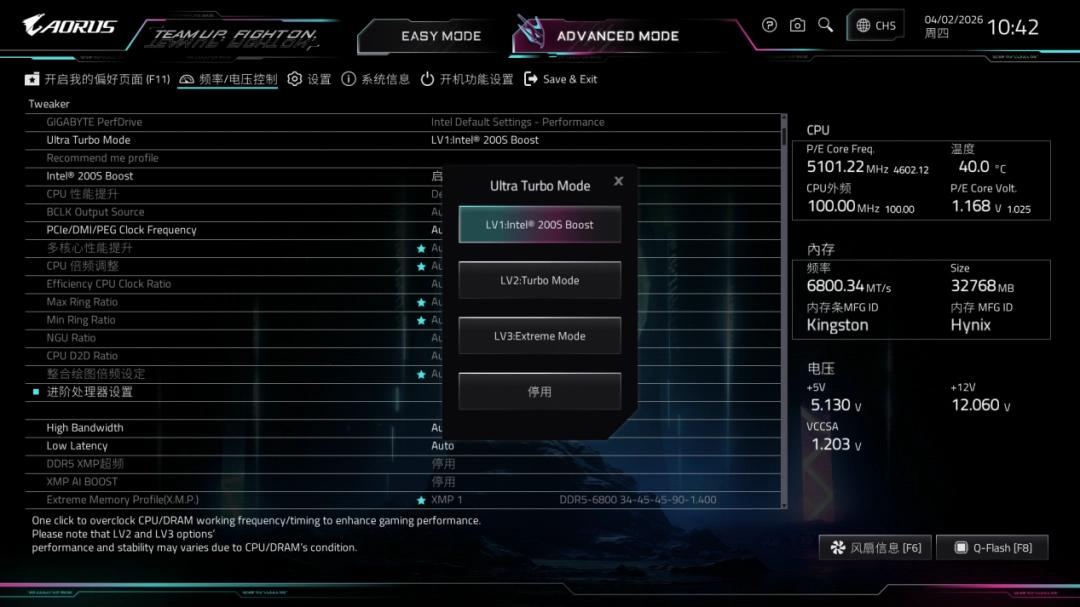 BIOS方面,技嘉这次升级了界面,支持一键截图和一键直达路径,可以实时显示CPU、系统和VRM温度。核心功能是Ultra Turbo模式,专门为酷睿Ultra 200S Plus系列解锁隐藏性能。它分为三档:LV1为默认开启的Intel 200S Boost,LV2为Turbo Mode,优化核心曲线并加速内存以提升游戏帧率,LV3为Extreme Mode,是激进的极限调校,全面释放处理器性能,专为电竞场景设计。