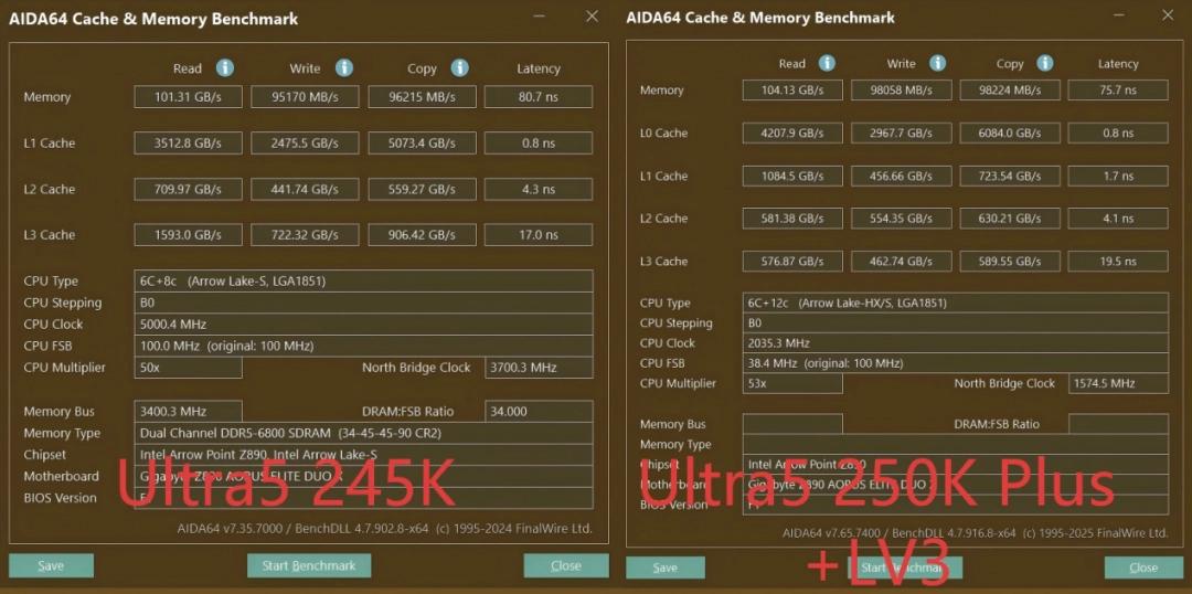 内存部分是这块主板的重点。它只配备了两根DDR5内存插槽,而不是常见的四根,这个设计是经过考量的。配合技嘉的D5 DUO X技术,通过CQ-DIMM架构升级、2-DIMM拓扑结构增强、PCB电路优化以及BIOS调校,用两根插槽就能实现传统四插槽的最大容量,同时大幅降低内存信号干扰,将超频潜力释放到标称10266MT/s。它还全面支持CUDIMM和CQDIMM内存,配合酷睿Ultra 5 250K Plus原生支持的DDR5-7200,能充分发挥新一代内存的低延迟高带宽特性。实际测试中,使用一对未超频的DDR5-6800MHz内存,搭配这块主板和Ultra 5 250K Plus,AIDA64内存延迟相比上一代Ultra 5 245K平台明显降低,开启主板的极限调校模式后延迟再降7%,读取写入速度也同步提升。