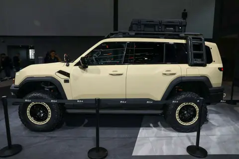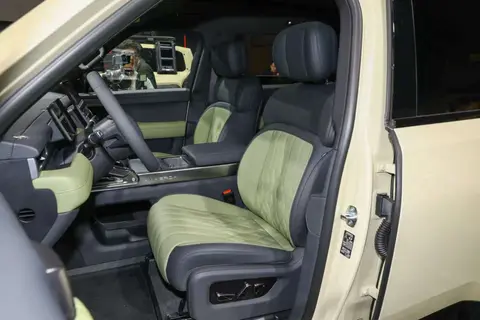 绕车一周后,我最大的感受是“矛盾的和谐”:它有硬派越野车的筋骨,轮拱、格栅、车身线条都透着力量感;又有新能源车型的精致,隐藏式门把手、流水转向灯、金属质感标识都经得起细看。它没有盲目追随“低风阻”“溜背到底”的潮流,而是坚持自己的风格,这种不随波逐流的态度,反而让它在同质化的汽车市场中格外抢眼。车身颜色方面,除了经典的极地白、陨石灰,还有专属的“英雄绿”金属漆,阳光下能呈现深浅渐变的效果,很符合其硬派定位。