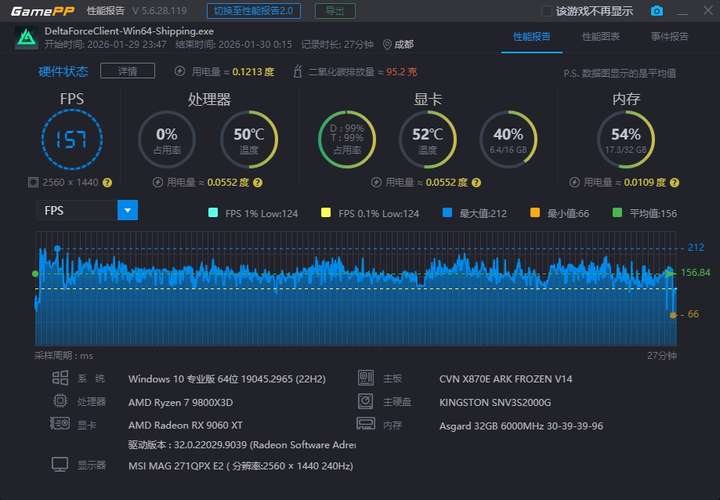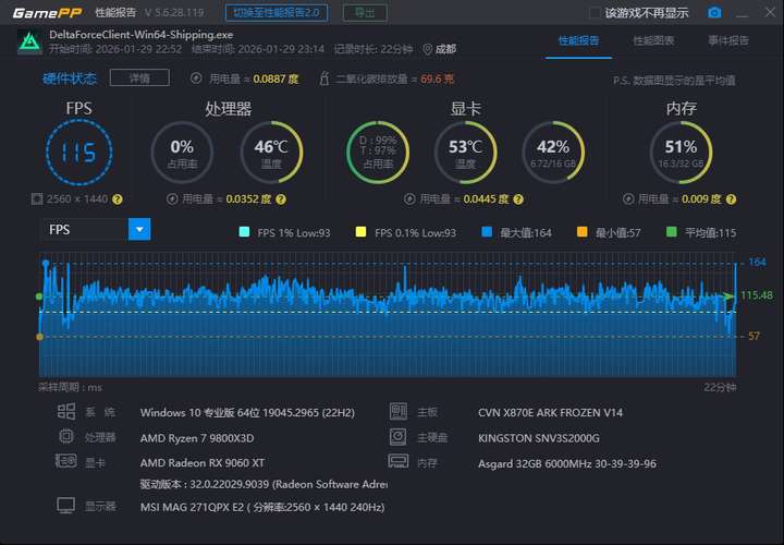 第一把为2K全极致特效设定,虽然三角洲行动是腾讯网游,按常理来看对配置要求并不高,但是实际上这款游戏基于UE5引擎开发,对配置要求并不低。在一局游戏后通过游戏加加汇总成绩,可以看到2K全极致下,游戏平均帧数115,1% Low帧也非常稳定,来到了93,显卡温度在满载的情况下基本维持53℃。