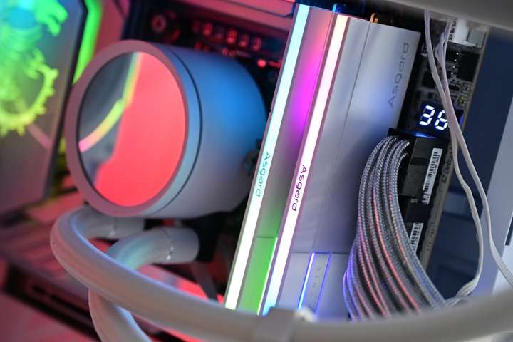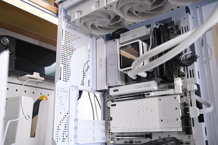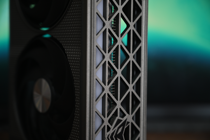 顶部最具辨识度的特征是贯穿式肩甲设计,其上集成了三角网状阵列 RGB 灯带,灯带呈长条形布局,与两侧的装饰区域形成呼应。该灯带支持5V ARGB神光同步,可通过蓝宝石 TRIXX软件实现自定义光效联动,包括静态、呼吸、彩虹、音乐律动等多种模式,在不同使用场景下均能呈现出恰到好处的视觉效果,且光效均匀柔和,无明显颗粒感。